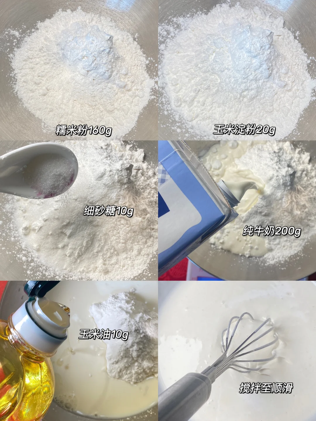 👩🏻🍳做法:1.糯米粉、玉米淀粉、细砂糖、纯牛奶、玉米油搅拌至顺滑。