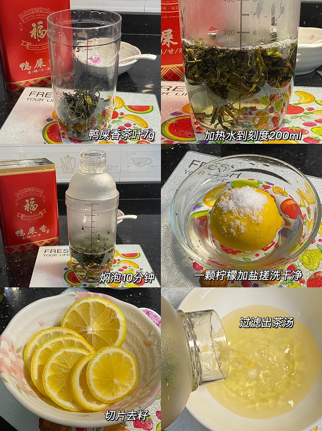 🍃食材:鸭屎香茶叶7g,黄柠檬(建议用香水柠檬,黄柠檬也不错子)自制糖浆40g,冰块。 🍃做法:1.鸭屎香茶叶7g,雪克杯中加热水到200ml刻度线焖泡10分钟。 2.一颗柠檬加盐搓洗干净,切片去籽,过滤出茶汤,加几块冰让茶汤快速降温。 3.放入柠檬片,加六块冰,捶打出柠檬汁,倒入茶汤,加40g糖浆,吧勺搅拌搅拌。 4.再加几块冰,至刻度线500ml即可,雪克!!! 5.倒入饮品杯中,很清爽,夏日喝超级解暑[赞R][赞R][赞R]