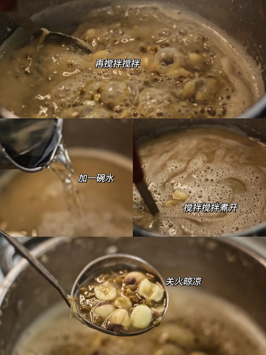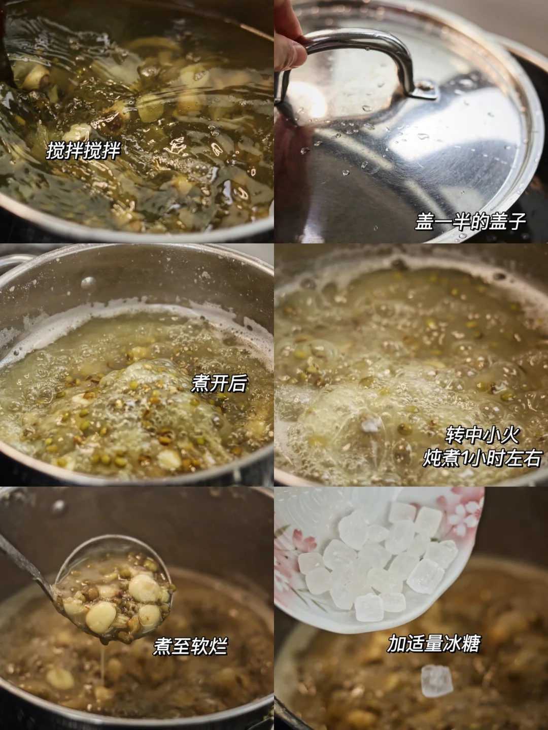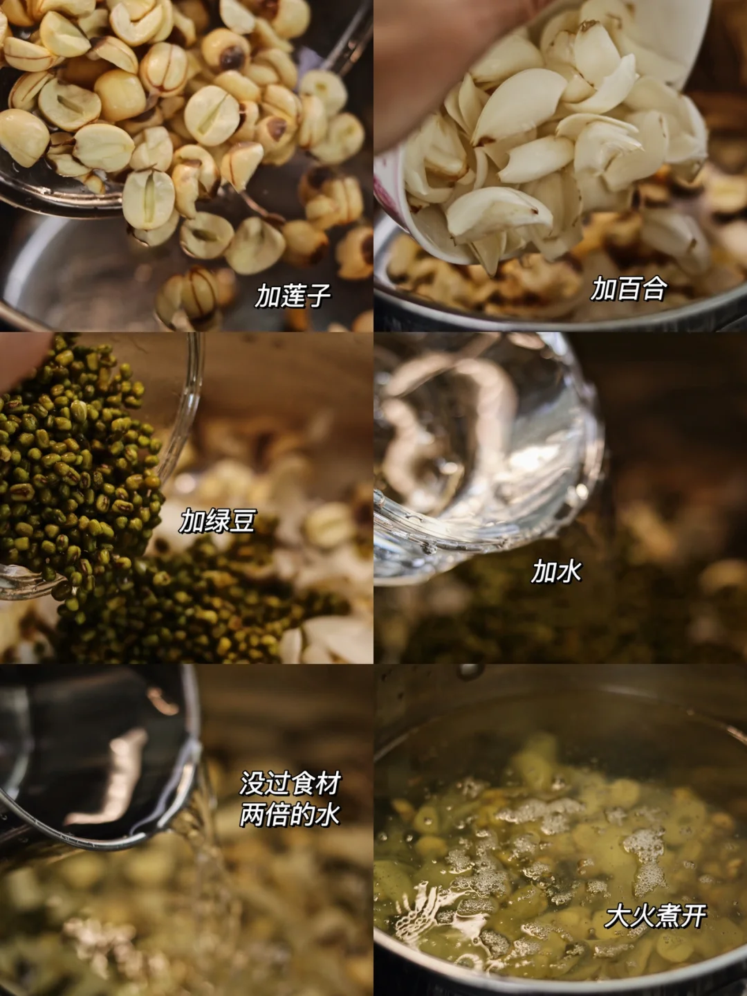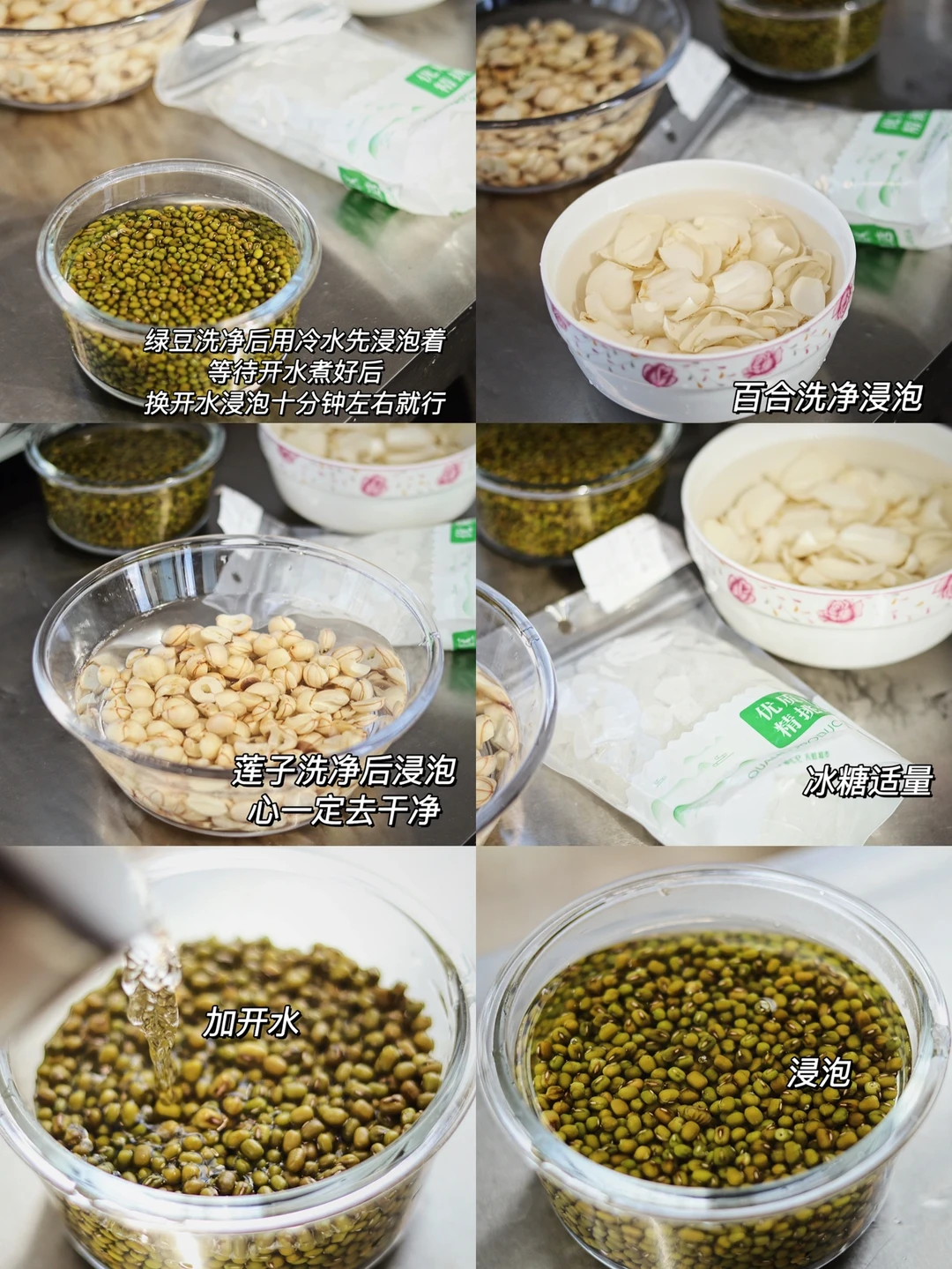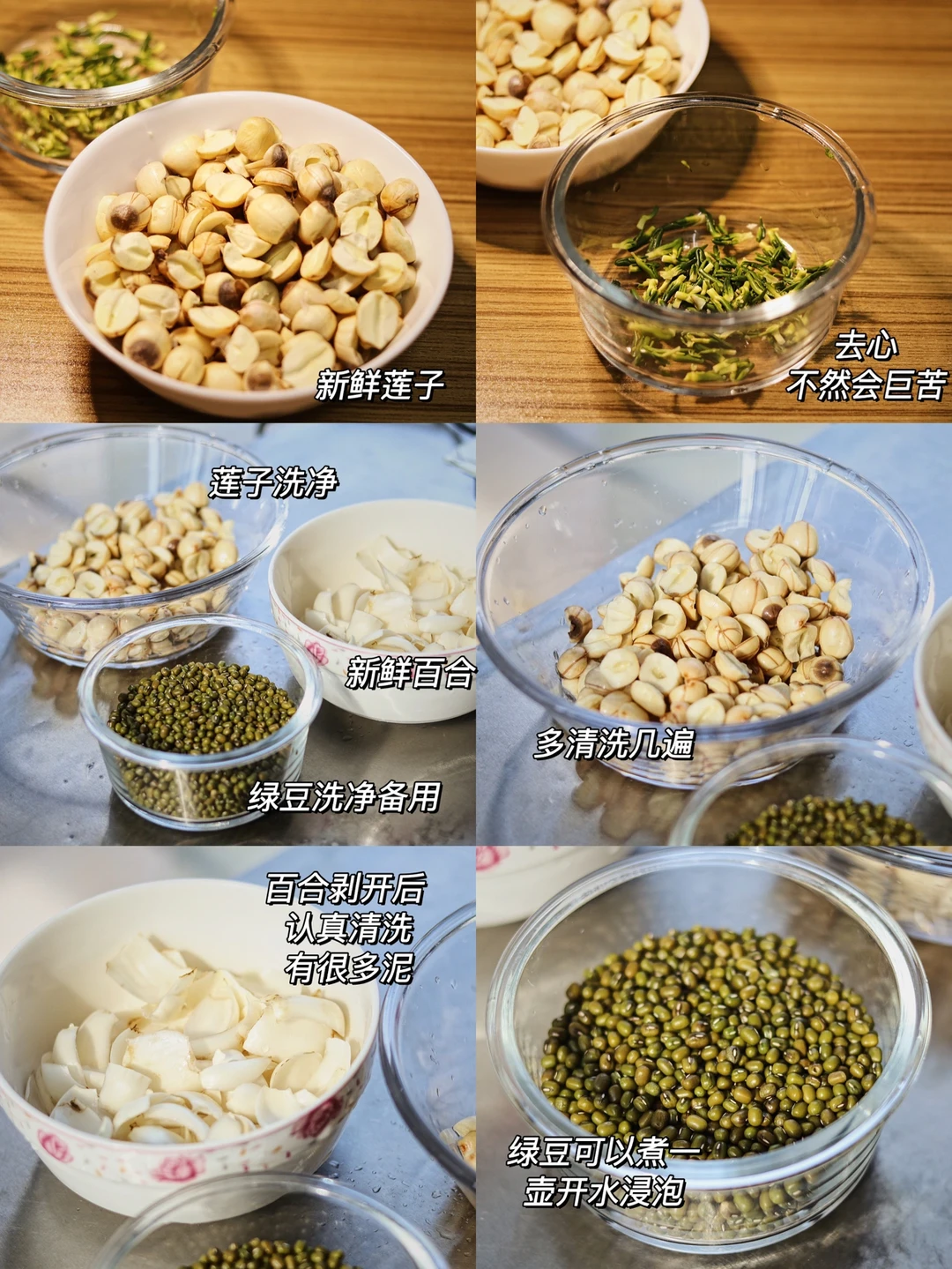 🍃食材:新鲜的莲子,绿豆,新鲜的百合,冰糖适量。 🍃做法:1.莲子去心,一定要去干净,不然会很苦,莲子心可用来泡茶喝。 2.百合要多清洗好几遍,有很多泥。 3.绿豆洗净后、加开水浸泡10分钟左右。 4.百合、莲子提前浸泡1小时左右。 5.锅中加莲子、百合、绿豆,加两倍的水没过食材。 6.大火煮开,搅拌搅拌,盖一半的盖子,煮开后转中小火炖煮1小时左右,煮至软烂之后,加适量冰糖。 7.再搅拌搅拌,加一碗水,搅拌搅拌煮开,关火晾凉。 🍃降火消暑,清热解暑绝绝子🌟