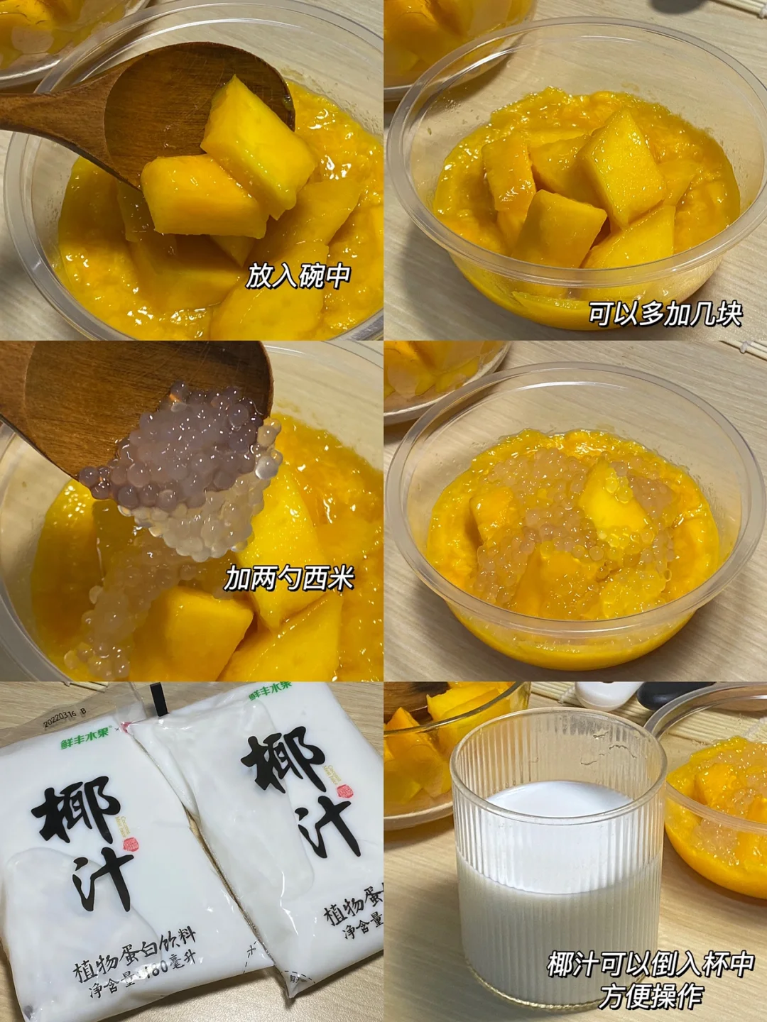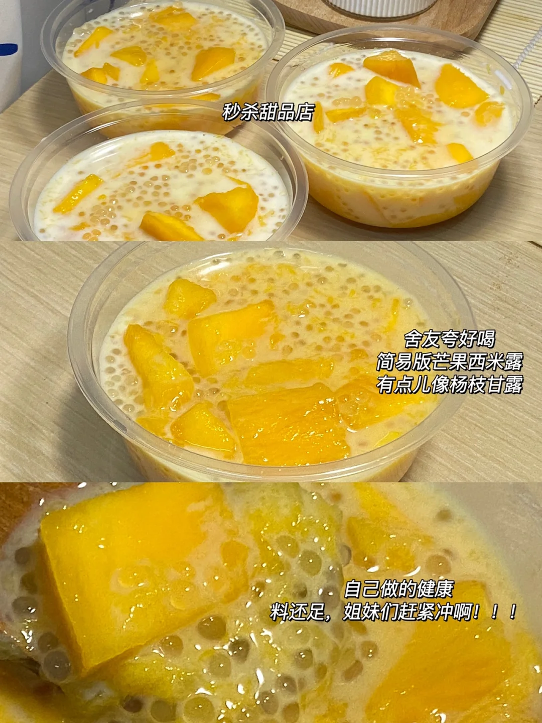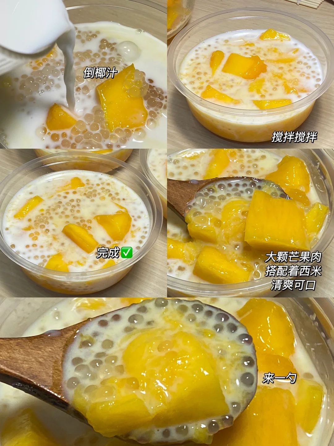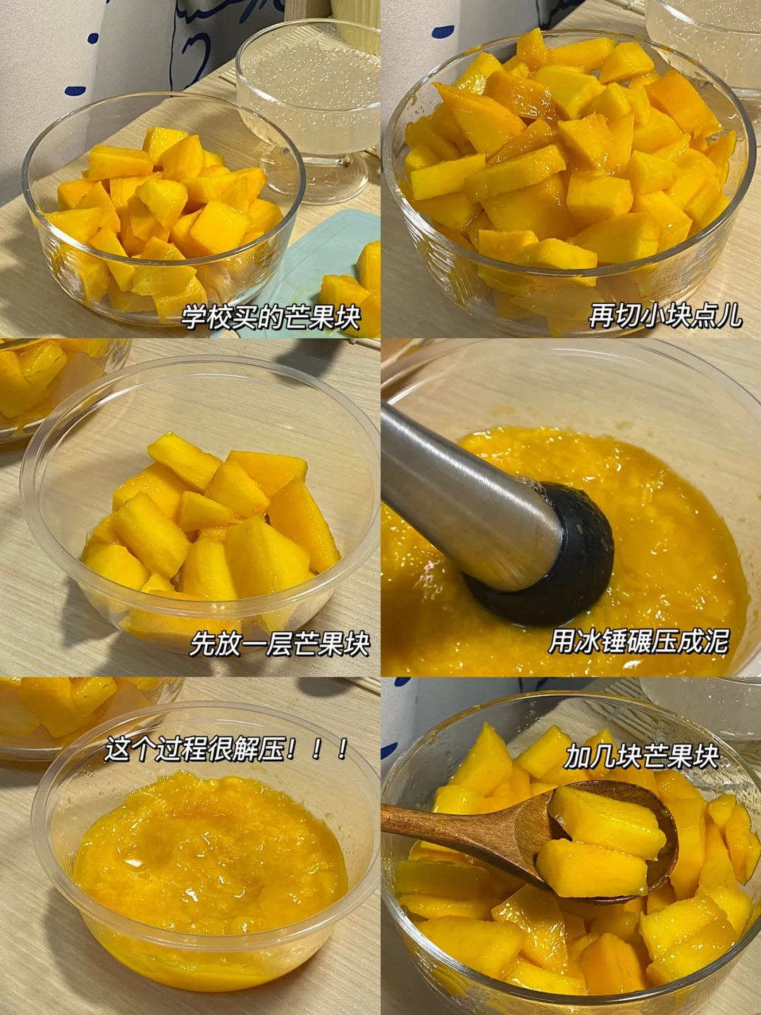 🥭食材:芒果,椰汁,西米。 🥭做法:先把芒果洗净去皮切块,尽量切小块点儿。 2.先放一层芒果块,用冰锤碾压成泥,这个过程很解压哦!!!再加几块芒果块在上面,加两勺西米。 3.椰汁先倒入杯子中,方便后面的操作,倒入椰汁(不用太多哦)搅拌搅拌,完成✅ 🥭大颗芒果果肉搭配着西米,清爽可口,真的是秒杀甜品店!!! 🥭舍友夸好喝!简易版芒果西米露,看着又有点儿像杨枝甘露,自己做的料很足,姐妹们赶紧冲啊!!!