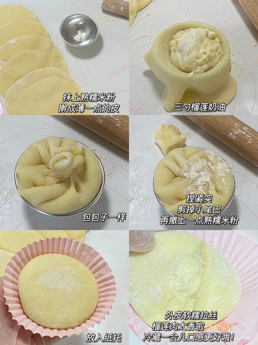 4.面团抹上熟糯米粉,擀成薄一点的皮,三勺榴莲奶油,包包子一样,捏紧实,剪掉小尾巴,再撒一点熟糯米粉,放入纸托。