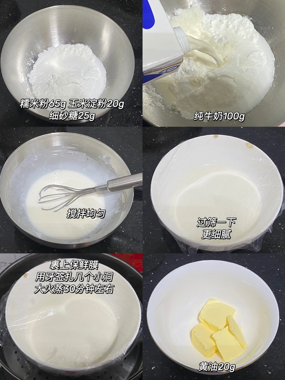 🌼外皮食材:糯米粉65g,细砂糖25g,玉米淀粉20g,纯牛奶100g,黄油20g。
