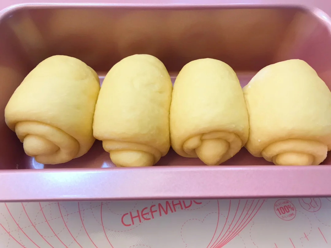 5.收口向下,同向放入吐司盒内,送进发酵箱进行发酵,并在内放置一碗热水,50分钟左右,发酵至9分满(如若没有发酵箱,也可以放烤箱内进行发酵,放置一碗热水,营造一个温暖湿润的环境)