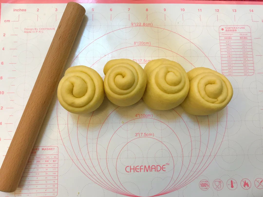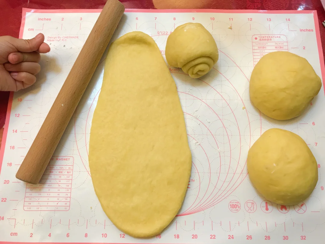 4.静置完毕后,把面团分别向两边擀面成舌状,两边往中间折,继续往两个方向擀长,往上往下卷,收口要捏紧、卷2.5-3圈为宜。