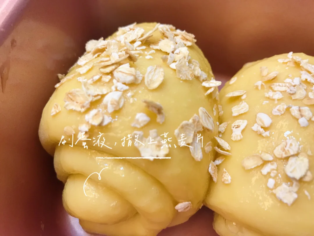 6.刷上一层蛋液,撒上即食燕麦片(也可杏仁片),然后送进预热好的烤箱,上下火175度(如若吐司上色太快,烤制10分钟后盖锡纸),30分钟左右。