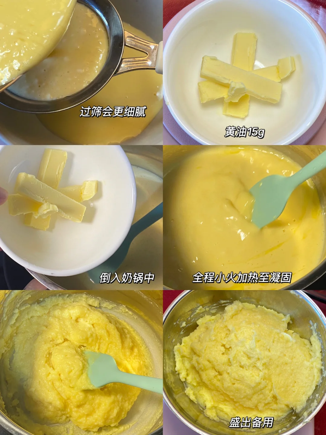2.过筛一下更细腻,加入黄油,全程小火搅拌至凝固即可,盛出晾凉备用,也可放进冰箱冷藏。