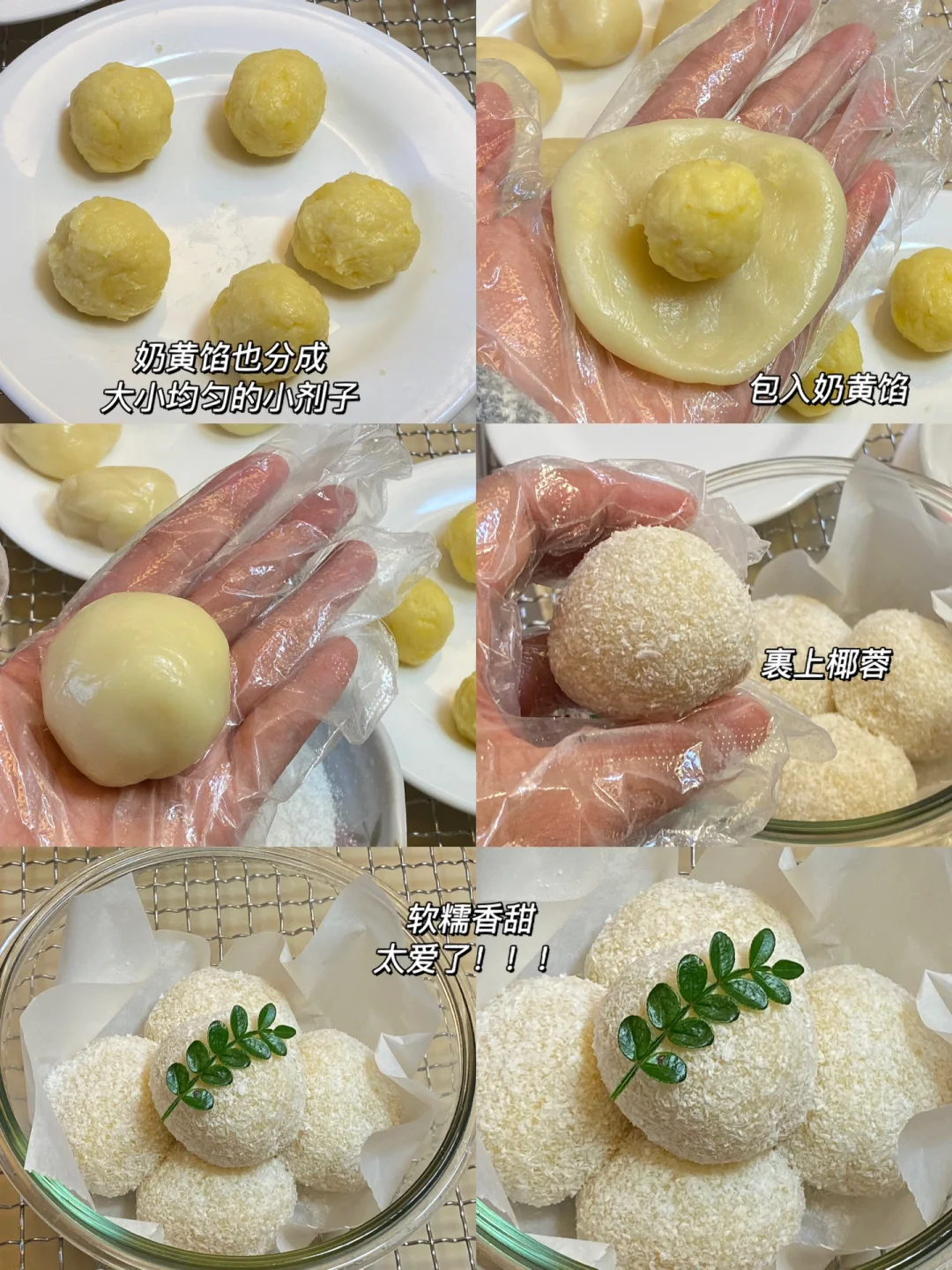 🥛外皮、奶黄馅各分成5个小剂子,包入奶黄馅,裹上椰蓉,软糯香甜太爱了!!!