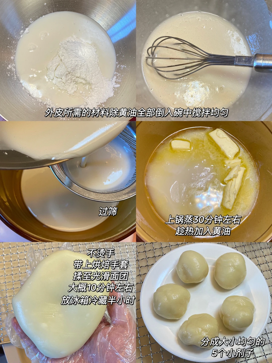 🥛外皮做法:1.外皮所需的材料除黄油外搅拌均匀过筛,盖上保鲜膜,上锅蒸30分钟左右。