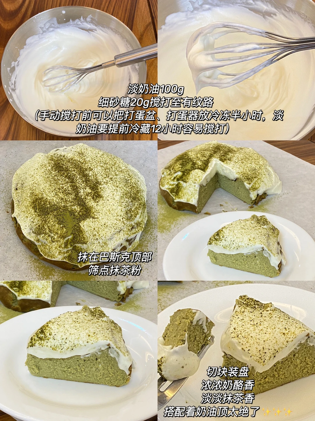 🌼打发淡奶油:家里没有打蛋器的也可以手动打发,但要提前冷藏淡奶油12小时以上,打发前把打蛋盆与打蛋器放冷冻半小时,这样成功效率会更高,淡奶油100g,细砂糖20g搅打至有纹路即可,抹在巴斯克顶部,筛点儿抹茶粉,切块装盘。
