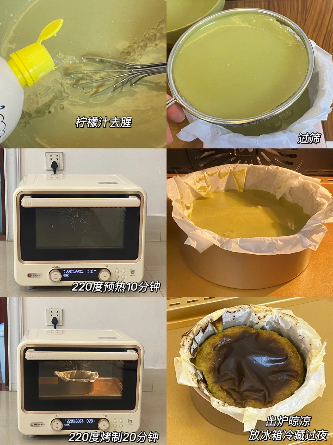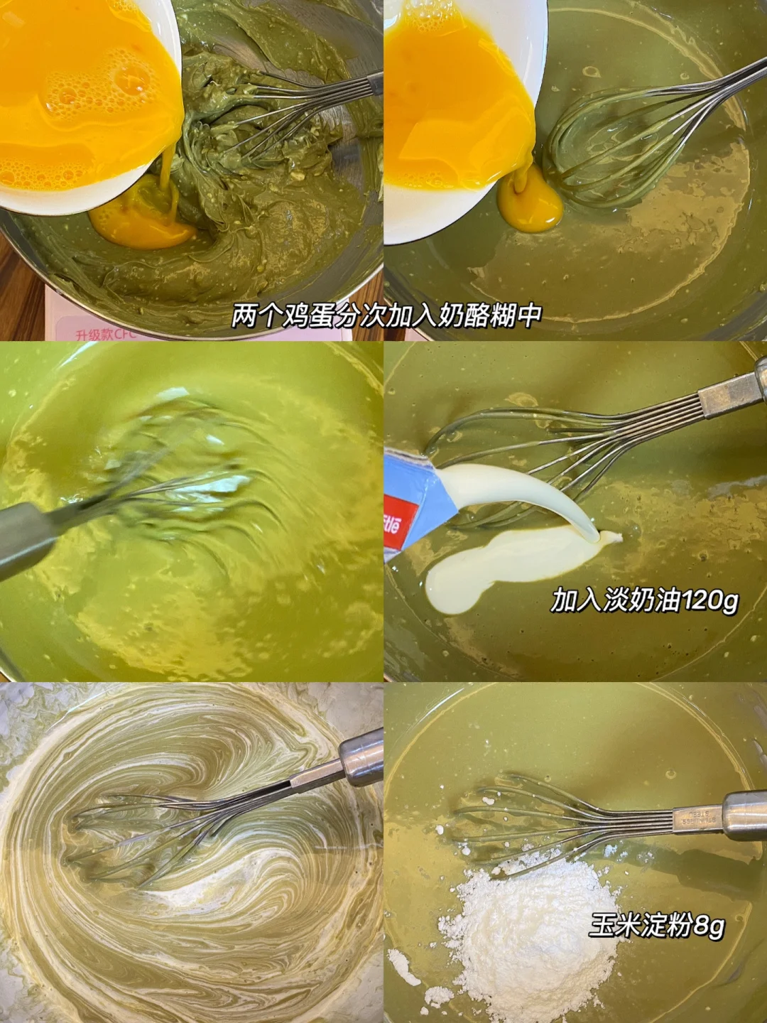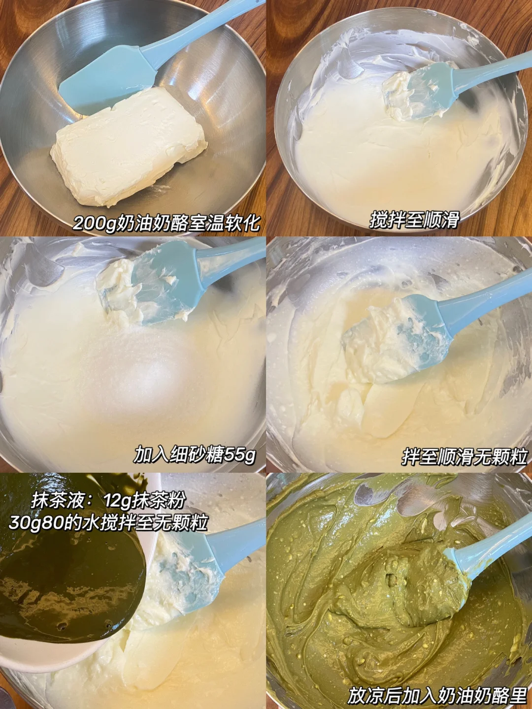 🌼食材:奶油奶酪200g,淡奶油120g,细砂糖55g,玉米淀粉8g,鸡蛋两个,柠檬汁,抹茶粉12g,30g80度水。
