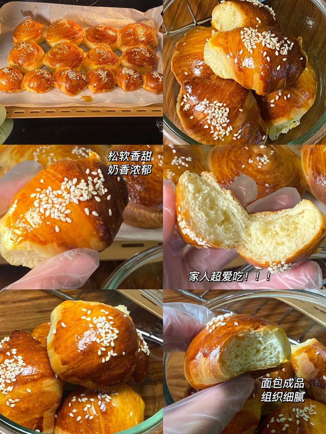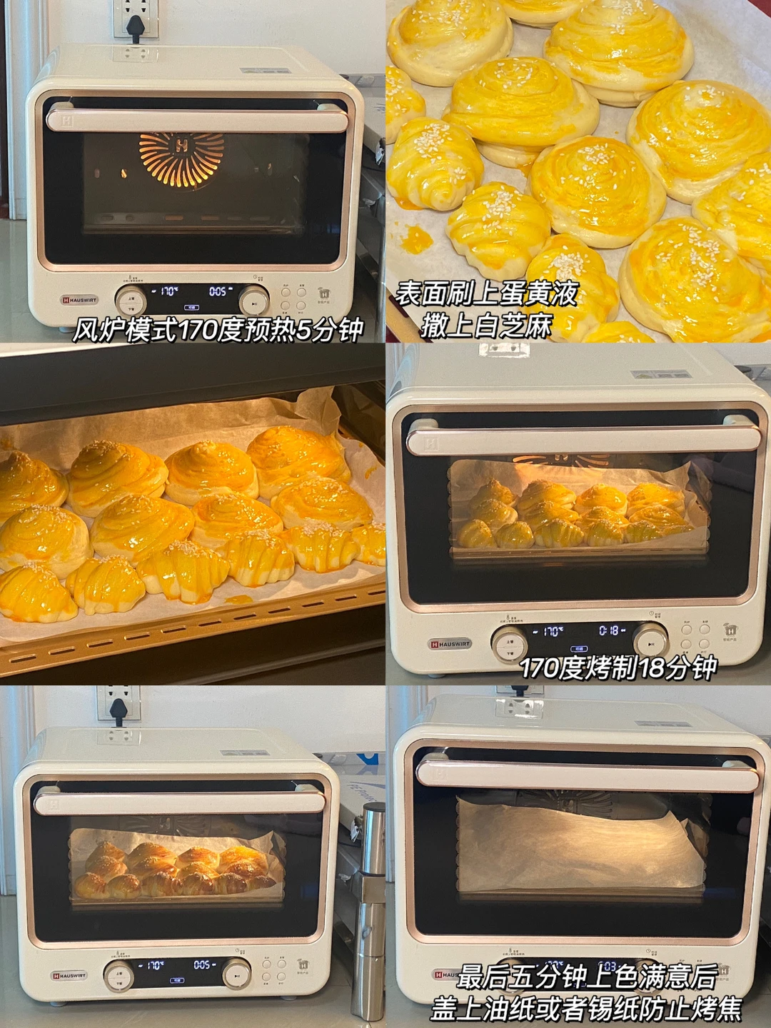 5.风炉模式170度预热5分钟,表面刷上蛋黄液,撒上白芝麻,烤制18分钟,最后五分钟上色满意后盖上油纸或者锡纸防止烤焦。