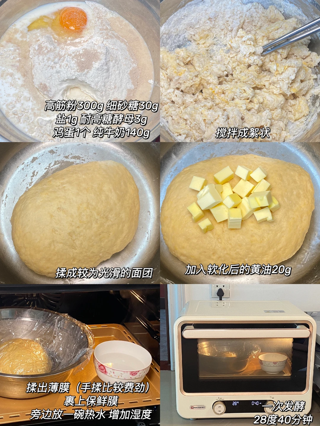 🥐食材:高筋粉300g,酵母3g,细砂糖30g,盐1g,鸡蛋一个,纯牛奶140g,黄油20g。