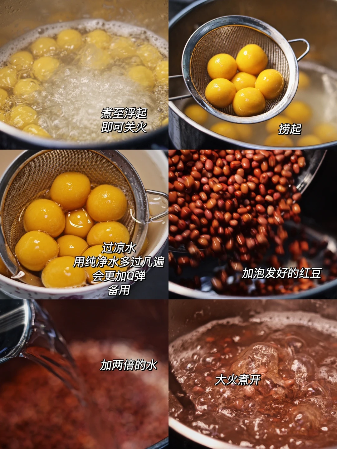 5.锅中加水,煮沸后下圆子,要不断搅拌防止糊锅,煮至浮起捞出过冷水,再用纯净水过几遍水,会更加Q弹,备用。