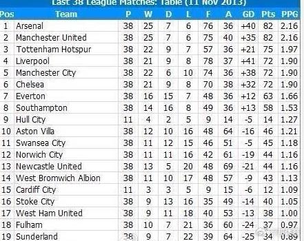 【阿森纳是冠军!近38轮积分超曼联】11月15日,尽管在上周末不敌曼联,但是本赛季战绩飘红的阿森纳如今仍然高居英超积分榜的头名,据101 Great Goals网站做出的统计,在过去38轮的英超联赛中,阿森纳的积分也是英超最高的,卫冕冠军曼联仅仅能排在第2位,而曼城和切尔西甚至都跌出了前4名。英超