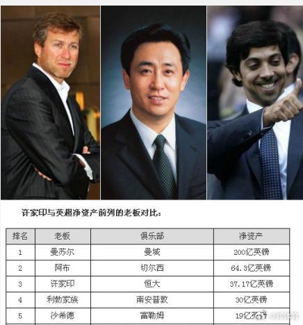 【英超土豪帮!六大家族总价347亿 曼城王5倍许家印】11月23日,恒大的成功可以在英超找到模板,切尔西和曼城便是例子,雄厚的资金,球星的堆积就是捷径。许家印和曼苏尔、阿布有很多相似,切尔西和曼城也堪称恒大的明灯和“老师”。事实上英超有六大土豪,可堪与许家印一较高下。英超