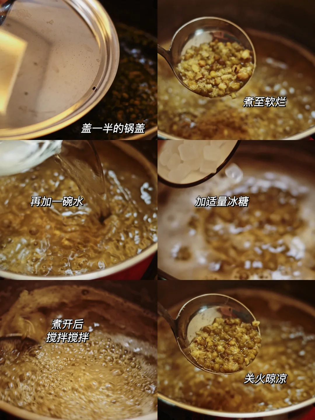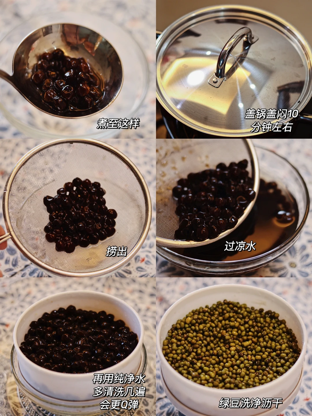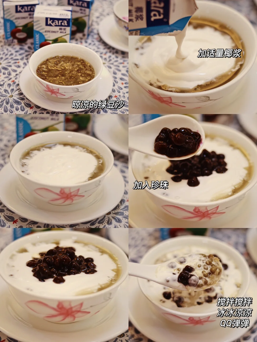 🍃食材:绿豆,珍珠,冰糖适量,椰浆。 🍃做法:1.锅中加入水,煮沸后加入珍珠,边搅拌边煮防止糊锅,煮至浮起,盖锅盖闷10分钟左右,捞出过凉水,再用纯净水多清洗几遍会更Q弹。 2.准备好绿豆,洗净沥干,开水煮沸后浸泡10分钟。 3.锅中加入浸泡好的绿豆,加入两倍的水,大火煮开,时不时搅拌搅拌,盖一半的锅盖。 4.煮至软烂,再加入一碗水,加适量冰糖,煮开后搅拌搅拌,关火晾凉。 5.碗中乘半碗晾凉的绿豆沙,加适量椰浆,加入珍珠,搅拌搅拌即可。 🍃绿豆沙冰冰凉凉,椰浆搭配Q弹的珍珠一绝🌟🌟🌟