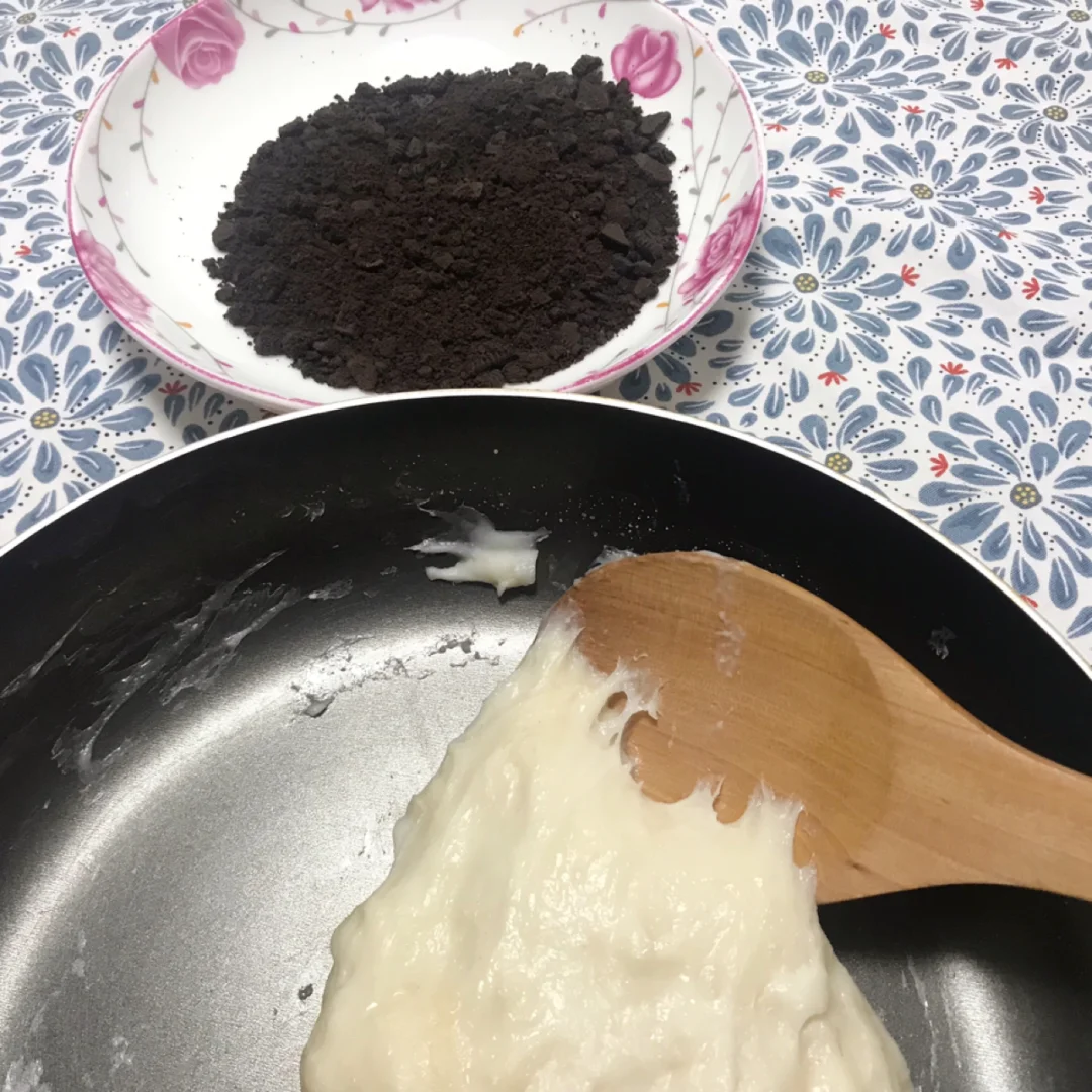 食材:纯牛奶200克,奥利奥饼干15克,白砂糖10克,木薯粉20克 步骤:1、将纯牛奶、木薯粉、白砂糖放进大容器中搅拌均匀 2、再放进不粘锅小火搅拌至粘稠成糊状 3、把奥利奥夹心用勺子挖掉只剩下饼干,再将饼干碾压碎放进大瓷盘中 4、做好的麻薯慢慢放进饼干碎上 5、也可放进冰箱冷藏半小时拿出口感会更棒哦 嘻嘻嘻 不用去台湾,在家也能做的鲜奶麻薯 Q弹的不得了🙆