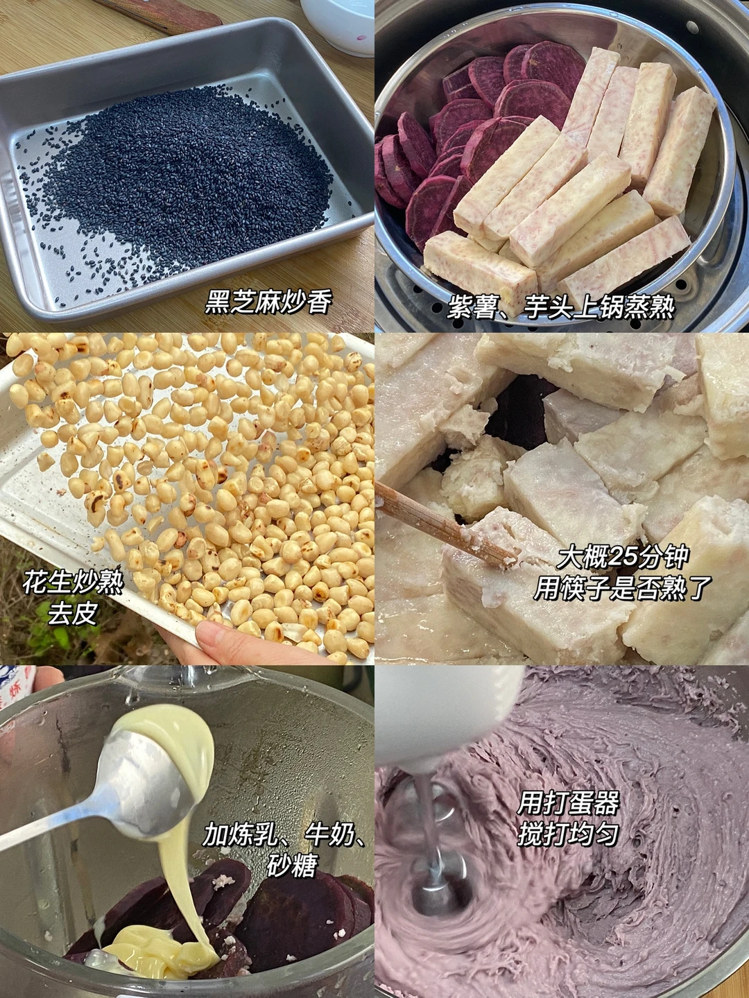 芋泥紫薯馅:紫薯、芋头,炼乳,牛奶,砂糖。