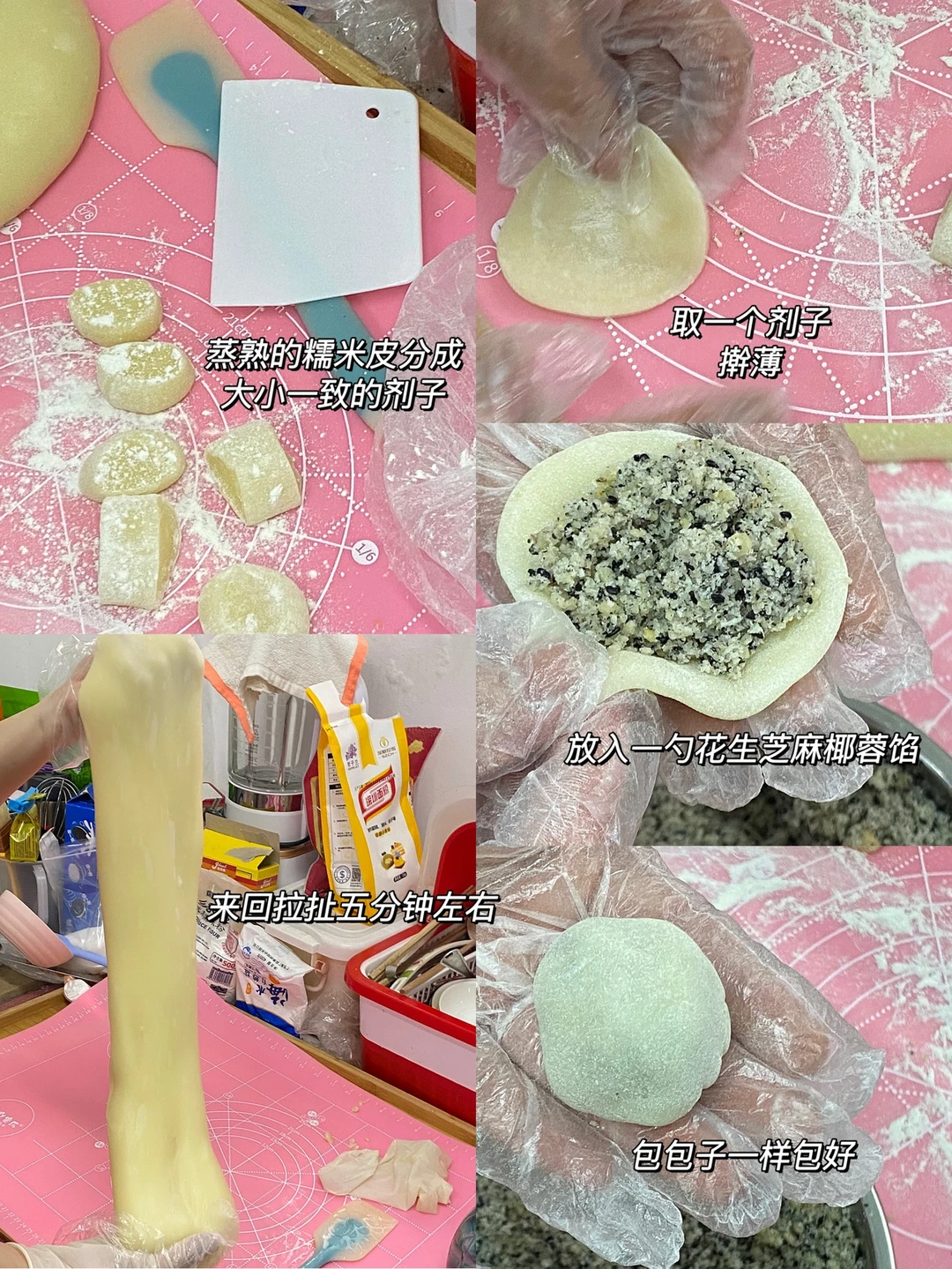 4.蒸熟的糯米皮粘一点儿熟糯米粉,分成大小一致的剂子,取一个剂子擀薄(但也不要太薄哦)放入一勺花生芝麻椰蓉馅,包包子一样包好。