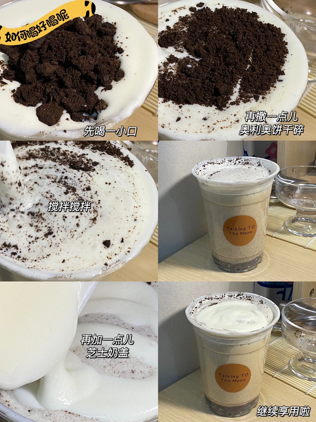 🍪如何喝好喝呢:先喝一小口,再撒一点儿奥利奥饼干碎,搅拌搅拌,再加一点儿芝士奶盖,继续享用[偷笑R]