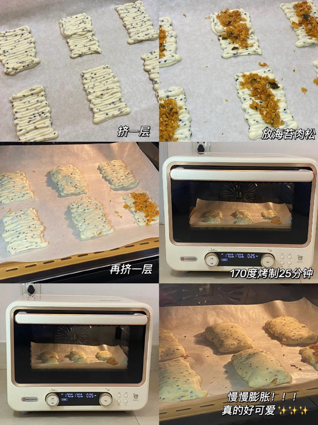 4.挤一层,放肉松,再挤一层,170度烤制25分钟,慢慢膨胀,真的好可爱!!!