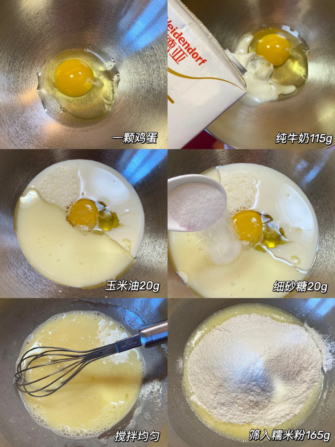 👩🏻🍳做法:1.鸡蛋、纯牛奶、玉米油、细砂糖,搅拌均匀。