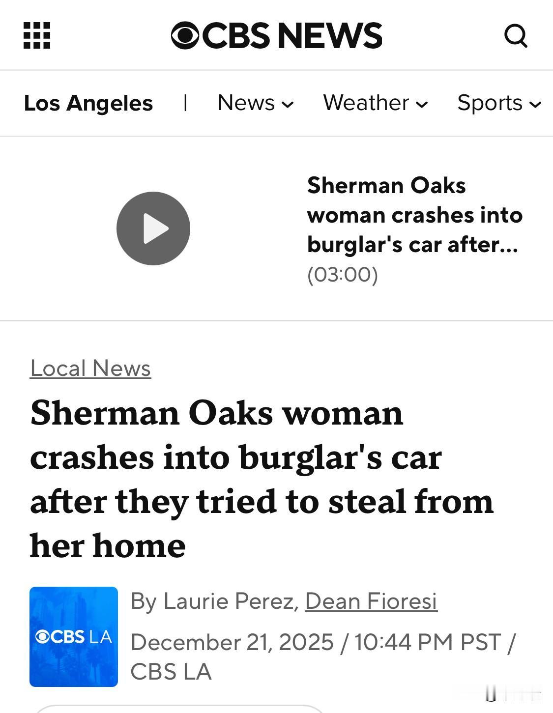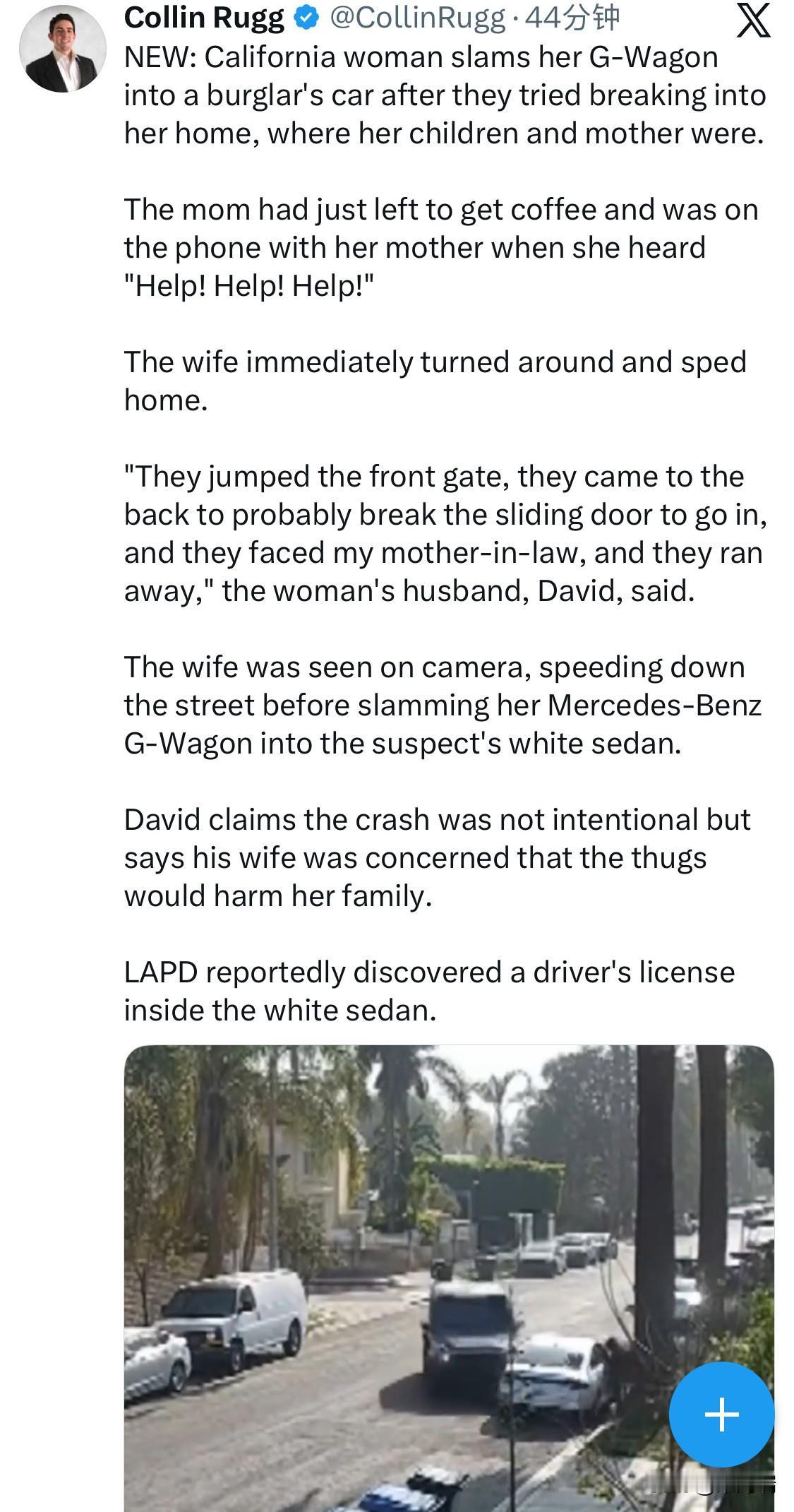 最新消息:加利福尼亚州谢尔曼奥克斯(Sherman Oaks)一名女子驾驶她的奔驰G级越野车猛撞窃贼的汽车,此前窃贼试图闯入她的家中,当时她的孩子和母亲都在屋内。 妈妈刚出门去买咖啡,正在和妈妈通电话,突然听到“救命!救命!救命!” 妻子立即调转车头,飞速赶回家。 “他们翻过前门,来到后门,可能是为了撬开滑动门进去,他们遇到了我的岳母,然后就跑了,”这名女子的丈夫大卫说。 监控录像显示,妻子驾驶着奔驰G级越野车在街上飞驰,然后猛烈撞向嫌疑人的白色轿车。 大卫声称车祸并非故意,但他说他的妻子担心暴徒会伤害她的家人。 据报道,洛杉矶警察局 (LAPD) 赶到现场后搜查了被遗弃的白色轿车,在车内发现了一个带有驾驶执照的钱包、撬棍等入室盗窃工具,以及一个调谐到 LAPD 无线电扫描仪的对讲机。