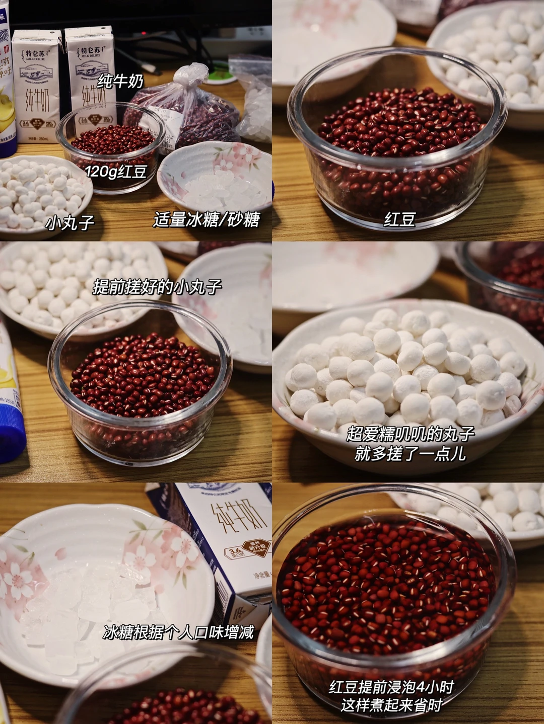 🍡食材:红豆120g,提前搓好的小丸子,纯牛奶,冰糖适量,炼乳。
