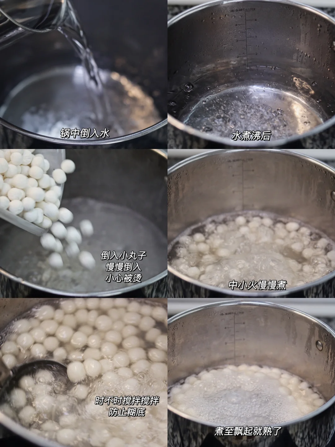 3.倒入小丸子,慢慢倒入,防止烫伤。