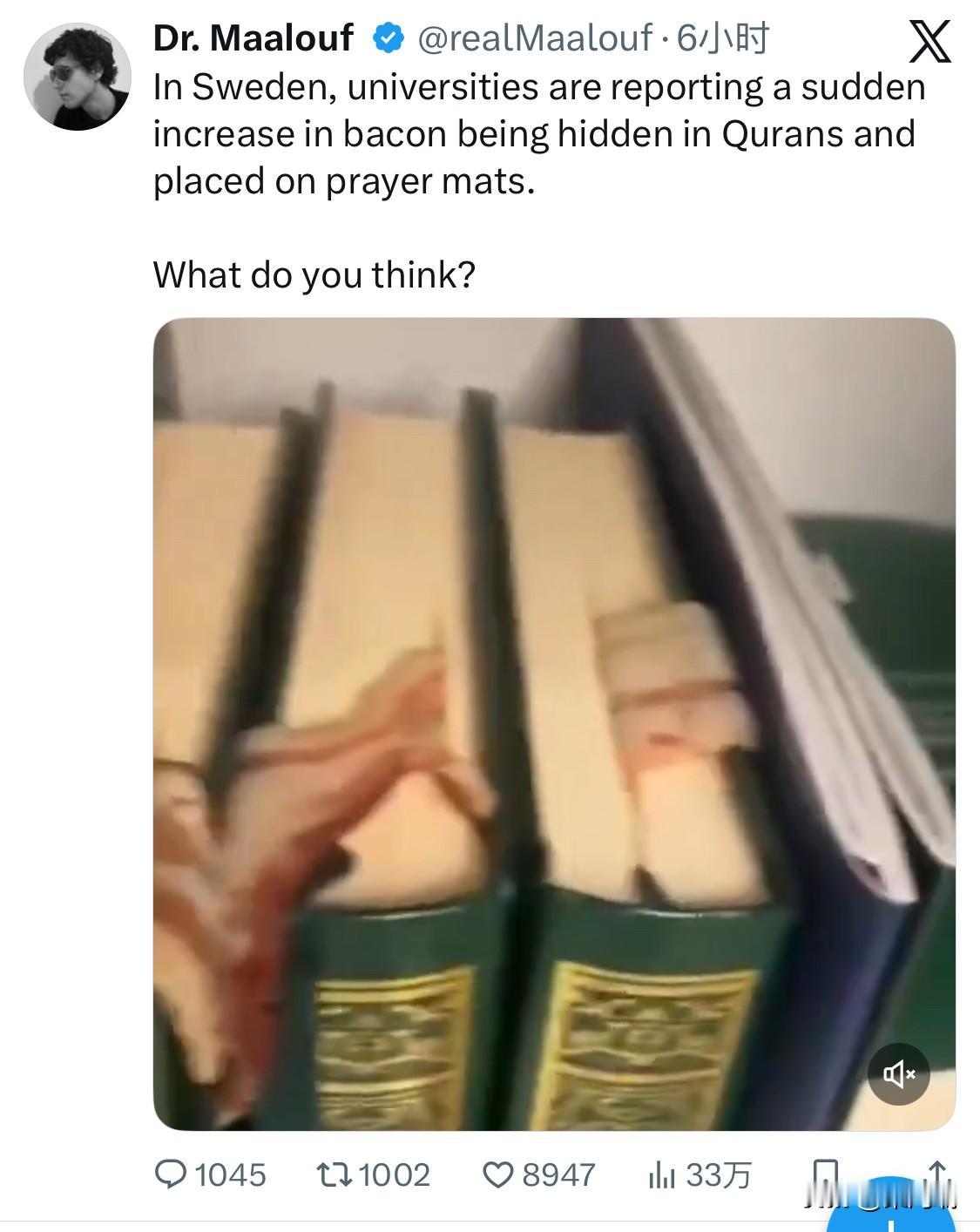 瑞典各大学报告称,藏在《古兰经》中或放在祈祷垫上的培根数量突然增加。 你怎么认为? 2025年2月,瑞典林奈大学(Linnaeus University)位于韦克舍(Växjö)的校区报告了一起严重的亵渎事件。学生在校内的祈祷室发现《古兰经》内被塞入了培根,且祈祷垫上也发现了培根碎片。 林奈大学校长彼得·阿隆松(Peter Aronsson)强烈谴责了这一行为,称其为“不可接受的侵犯”,并强调大学对任何形式的歧视采取零容忍政策。该校已向警方报案,将其视为针对特定群体的仇恨犯罪或破坏行为进行调查。 社会背景: 此类事件并非孤立存在。瑞典在2025年持续面临因焚烧或亵渎《古兰经》引发的社会紧张。2025年2月,瑞典法院曾判定一名参与焚烧《古兰经》的人员犯有仇恨罪。截至2025年底,关于瑞典各大学此类事件“突然增加”的讨论在社交媒体和部分新闻平台上有显著上升。