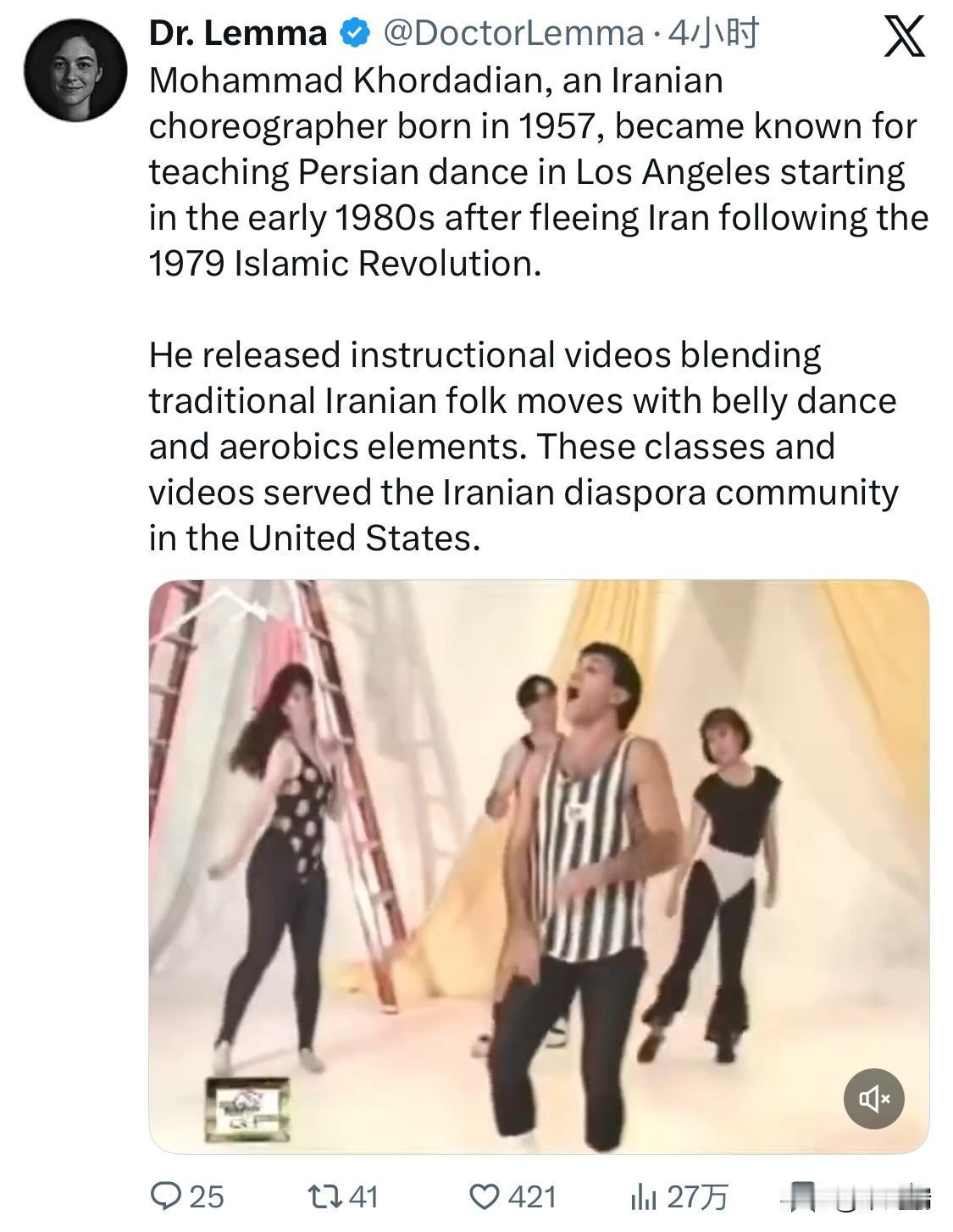 穆罕默德·霍尔达迪安是一位1957年出生的伊朗编舞家,在1979年伊斯兰革命后逃离伊朗,并于20世纪80年代初开始在洛杉矶教授波斯舞蹈,并因此而闻名。 他发布了一系列教学视频,将伊朗传统民间舞蹈动作与肚皮舞和健美操元素融合在一起。这些课程和视频服务于美国的伊朗侨民社区。