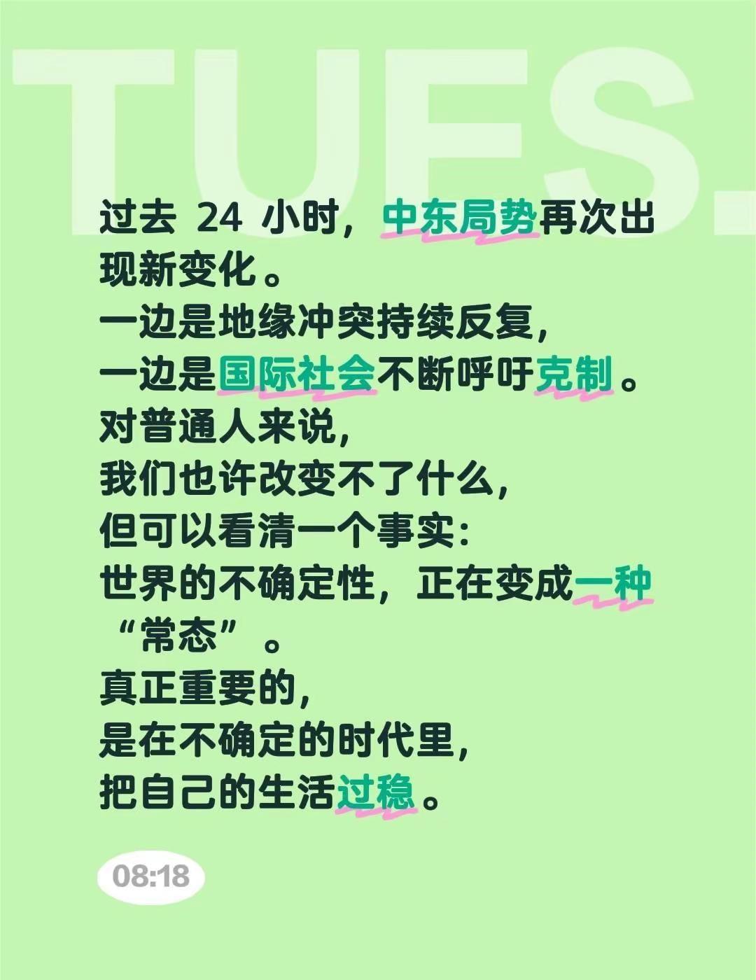 你觉得,未来几年世界会更稳定吗。过去 24 小时,中东局势再次出现新变化。一边是地缘冲突持续反复,一边是国际社会不断呼吁克制。对普通人来说,我们也许改变不了什么,但可以看清一个事实:世界的不确定性,正在变成一种“常态”。真正重要的,是在不确定的时代里,把自己的生活过稳。