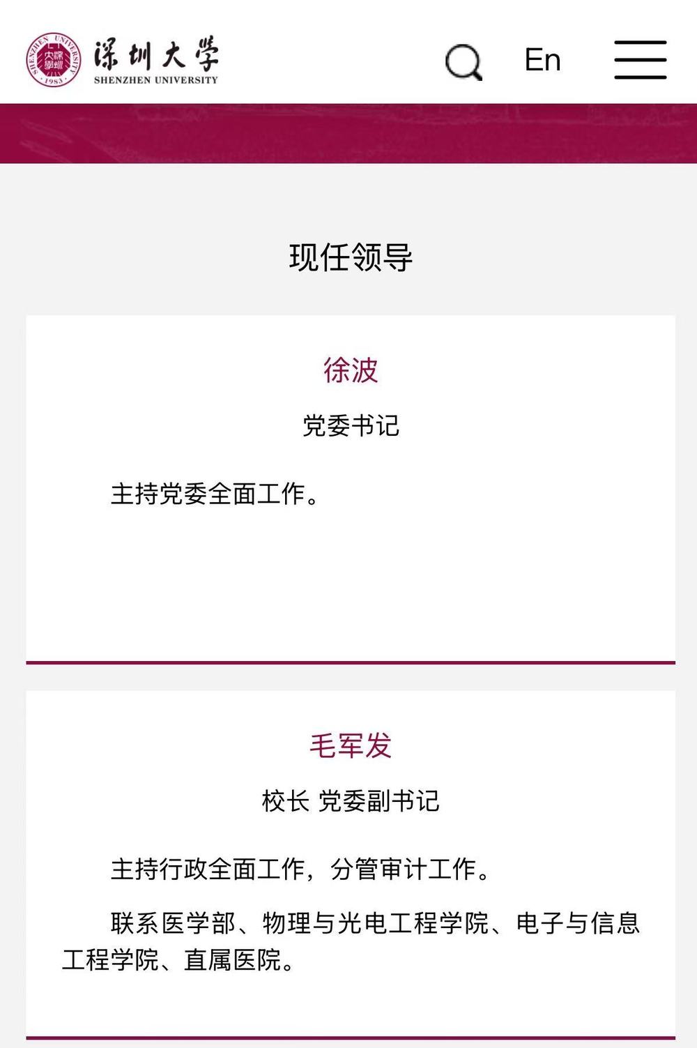 23日,记者从深圳大学官网获悉,“现任领导”一栏中,徐波已任深圳大学党委书记,主持党委全面工作。