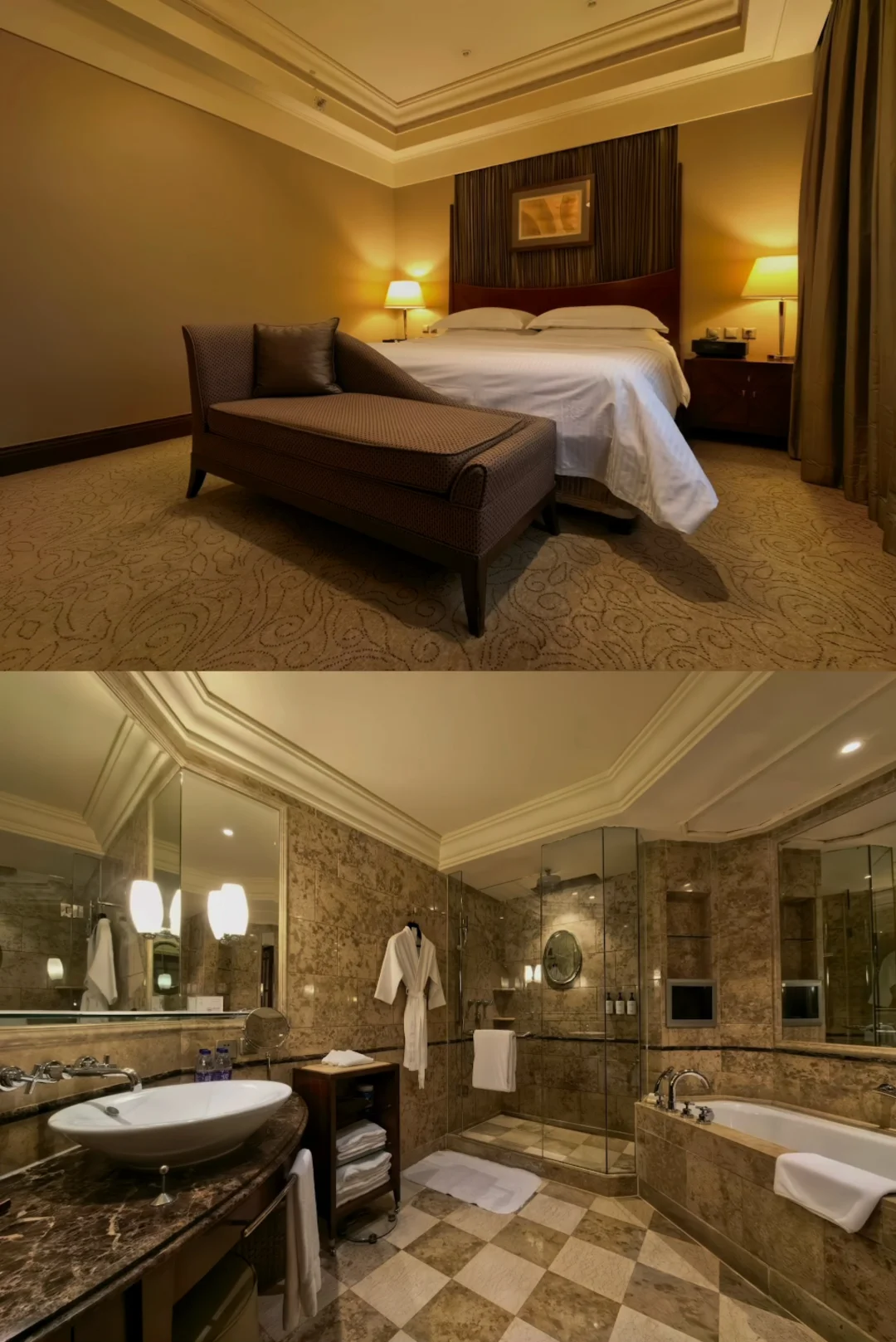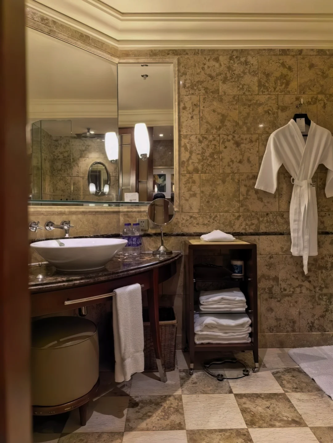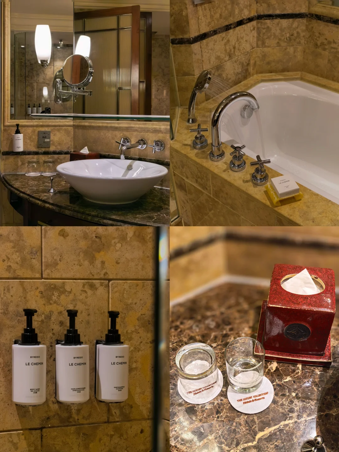 入住时给了一间72平的豪 华套房,洗漱间是那个经济上行时期全大理石配置,还配了洗漱椅;浴缸旁边的小电视机、柜子里分区清晰的多格抽屉,托盘里面餐布、餐巾、定制杯垫等,都是老派酒店才有的讲究。