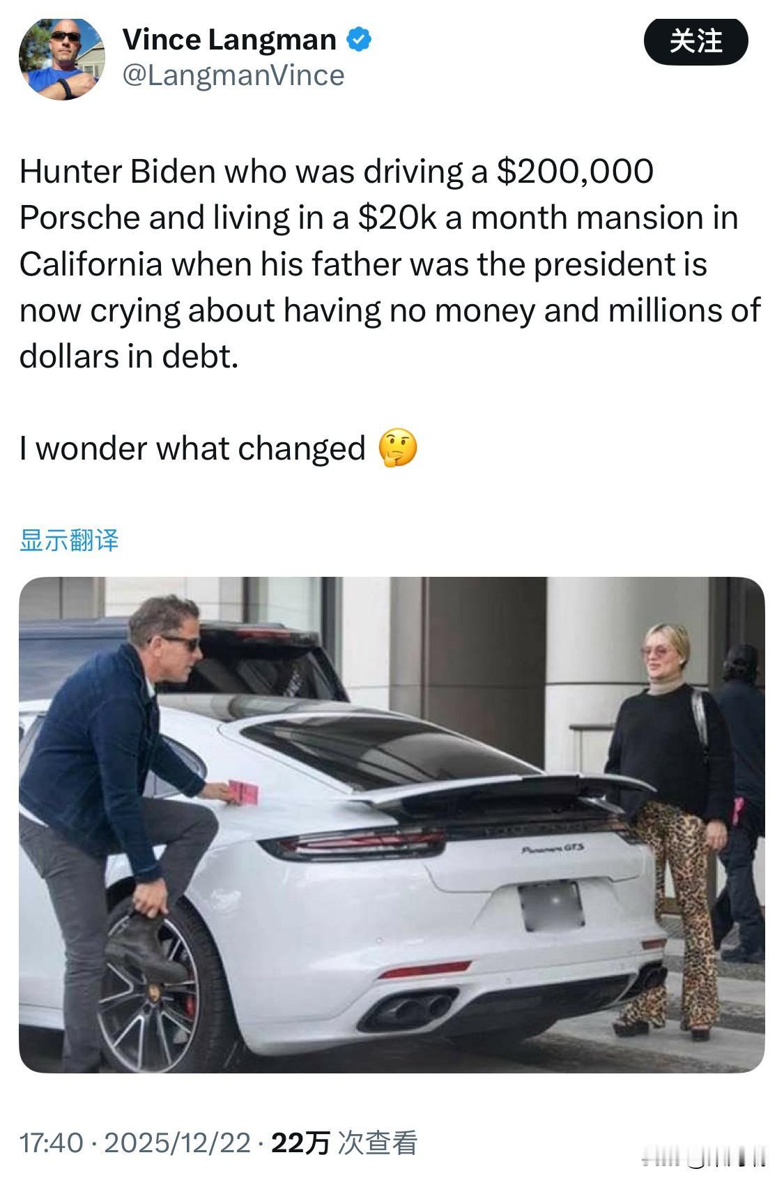 亨特·拜登在他父亲担任总统期间,开着价值 20 万美元的保时捷,住在加州每月租金 2 万美元的豪宅里,如今却哭诉自己没钱,还背负着数百万美元的债务。