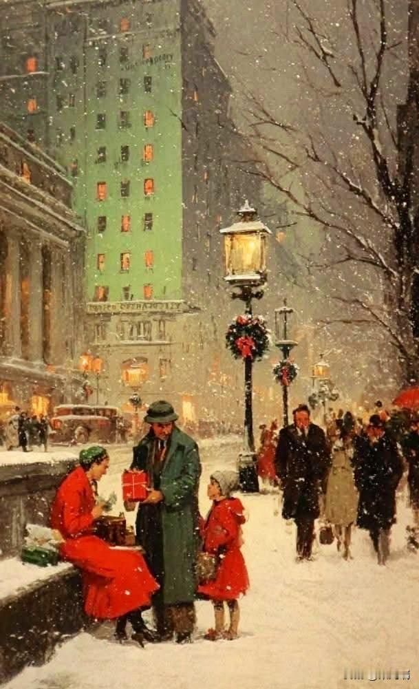 这幅画作是美国艺术家 G. Harvey(Gerald Harvey Jones) 的作品,名为《傍晚时分的大道》(Evening Along the Avenue)。 画作描绘了冬季城市街道的圣诞雪景,充满了怀旧和温暖的节日氛围。 艺术家 G. Harvey 以其印象派风格而闻名,善于捕捉城市生活场景,尤其是反映 19 世纪末至 20 世纪初纽约市的优雅和浪漫气息。 画面中,积雪覆盖的街道上,人们穿着复古服饰,街灯散发着温暖的光芒,一栋带有发光窗户的绿色建筑在雪景中格外醒目,营造出一种宁静而神奇的节日气氛。