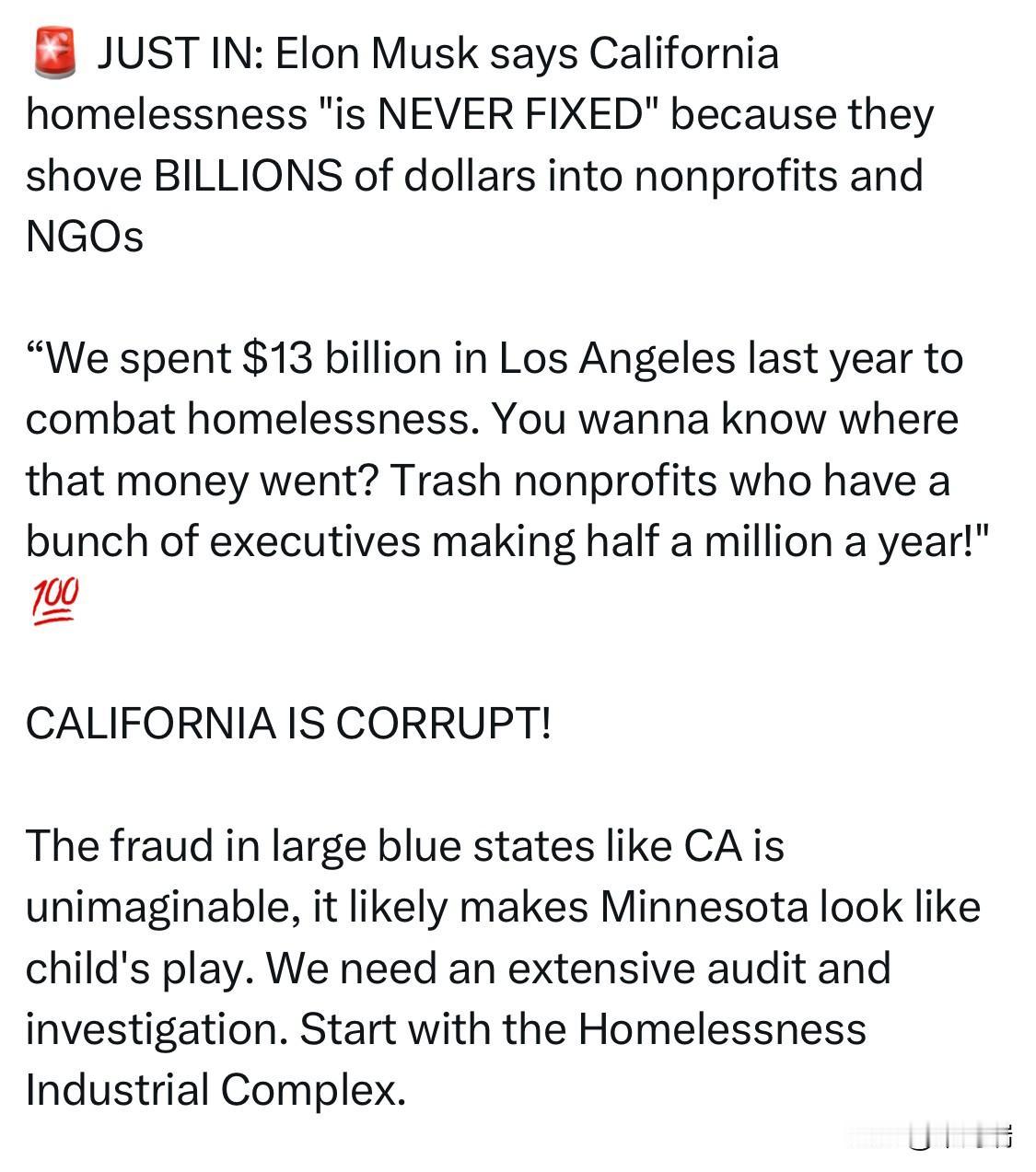 最新消息:埃隆·马斯克称加州无家可归问题“永远无法解决”,因为他们把数十亿美元投入到非营利组织和非政府组织中。 “去年我们在洛杉矶花了130亿美元来解决无家可归问题。你想知道这些钱都去哪儿了吗?都进了那些垃圾非营利组织的口袋,而这些组织的领导年薪却高达50万美元!” 加州腐败透顶! 像加州这样的大蓝州的欺诈行为令人难以置信,相比之下,明尼苏达州的欺诈行为简直就像小儿科。我们需要进行全面的审计和调查。就从无家可归者产业综合体入手吧。