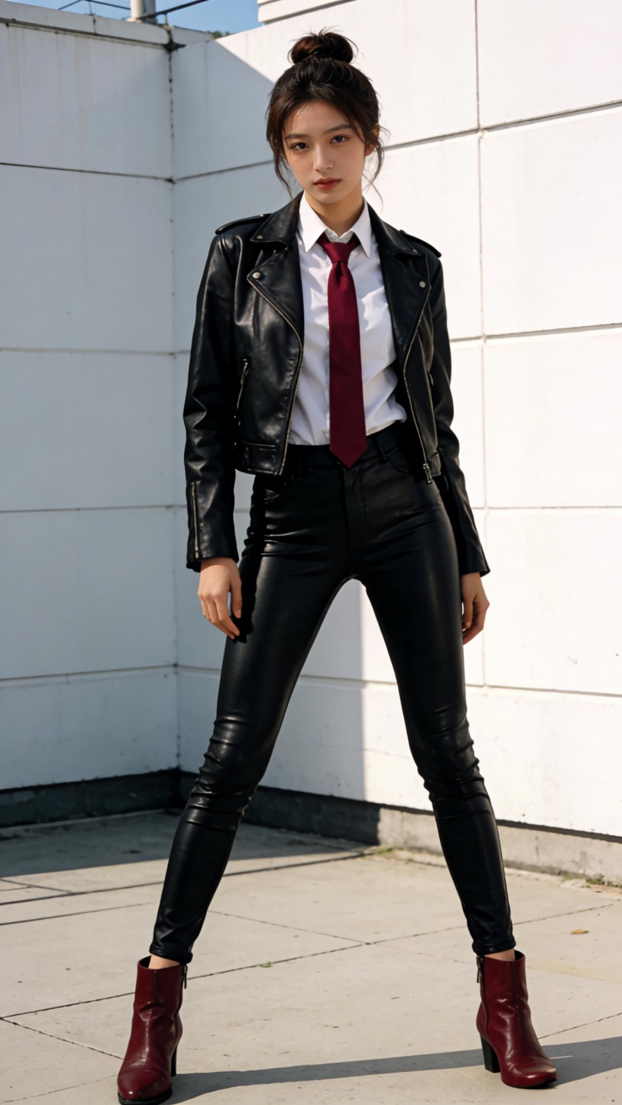 酷炫的皮衣搭配红领带。显气质皮衣穿搭 气质范穿搭皮衣