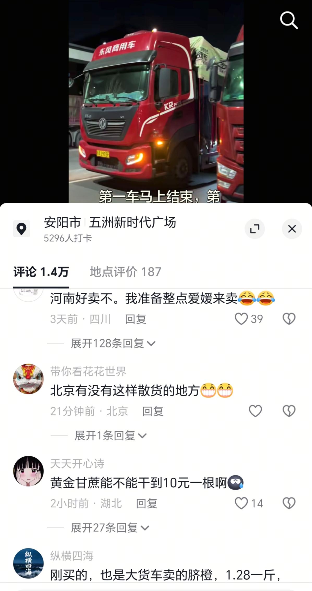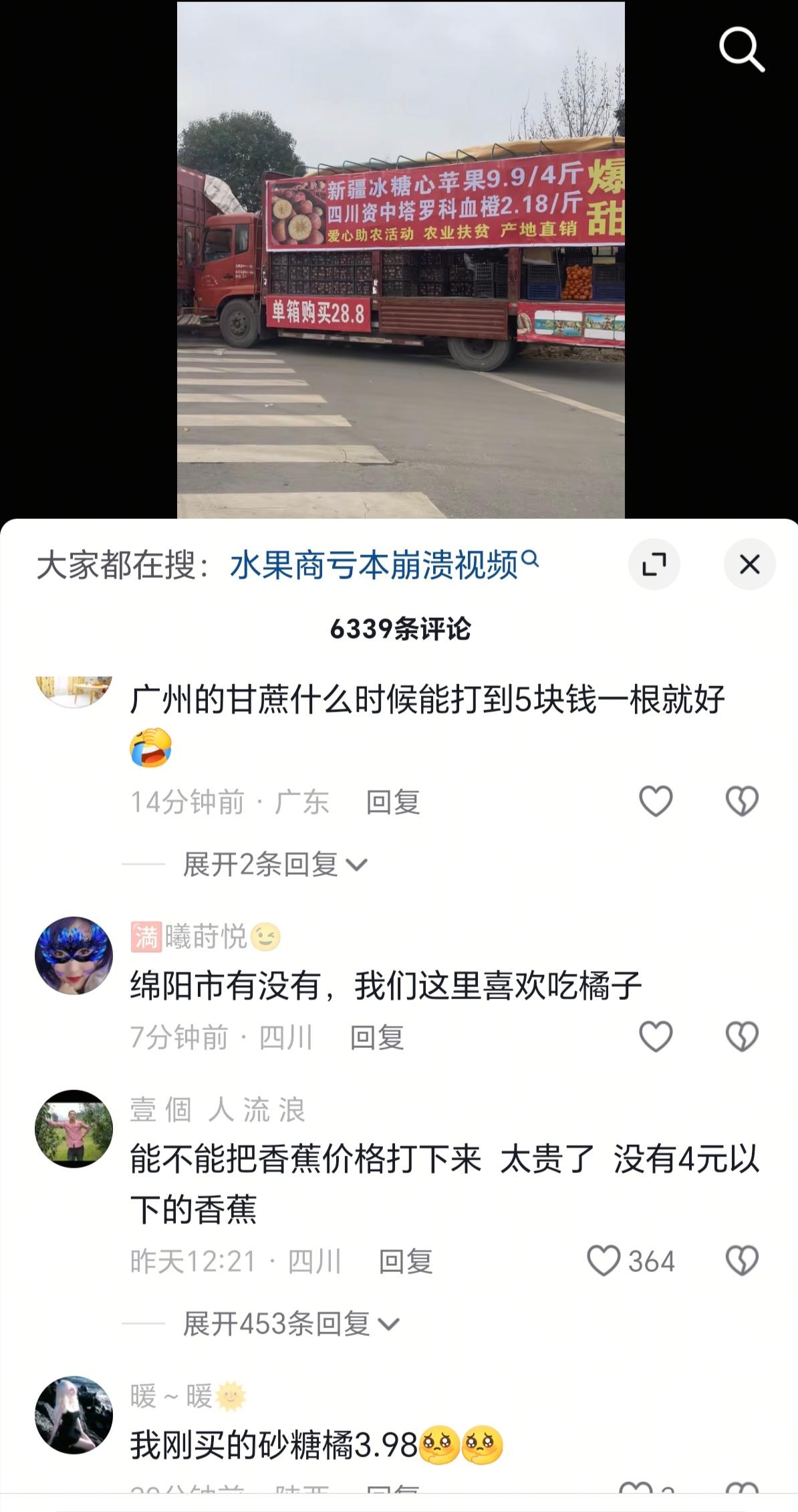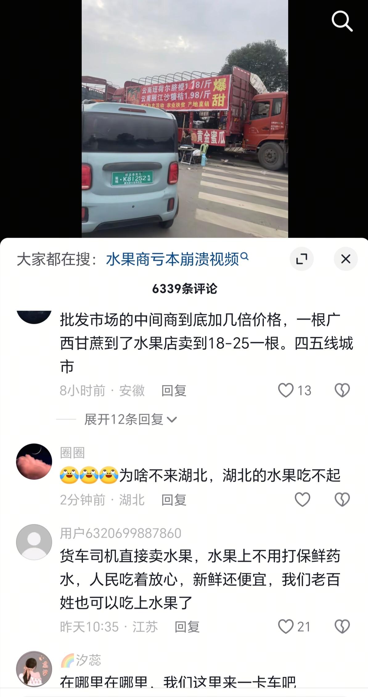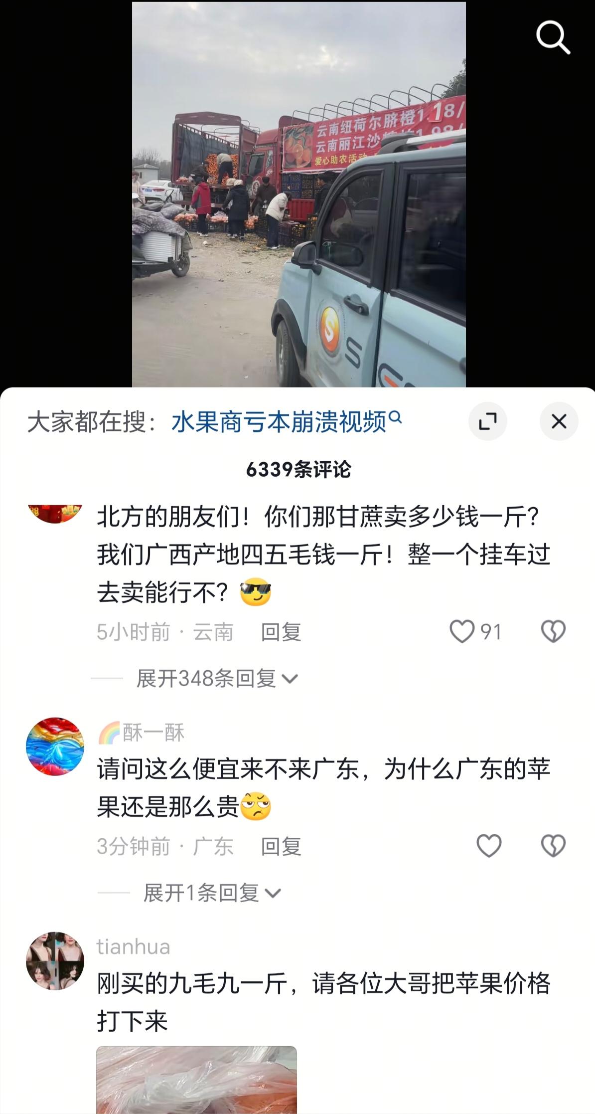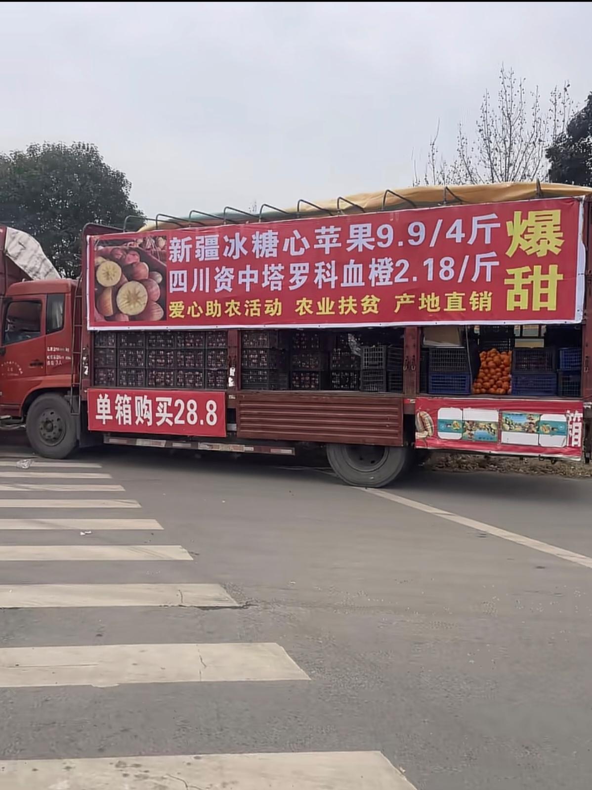 货车司机和水果商卷起来了。水果商压车费钱,货车司机自己直接进货,拉到小地方自己直接开卖、挂车零卖。不求利润,只需把自己应得的车马费给整出来。 全国货车司机大有自己单干的趋向。一方面果农把货卖出去了,乐呵;一方面消费者买到了低价水果,也乐呵。唯一可能的是有些地方货物供应不平衡。 有的超市,橙子卖到0.99元。路边的脐橙1.18元一斤,苹果9.9元4斤,这谁看了不买。