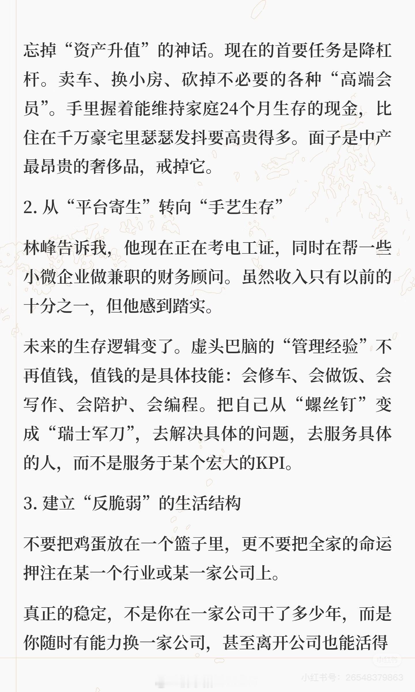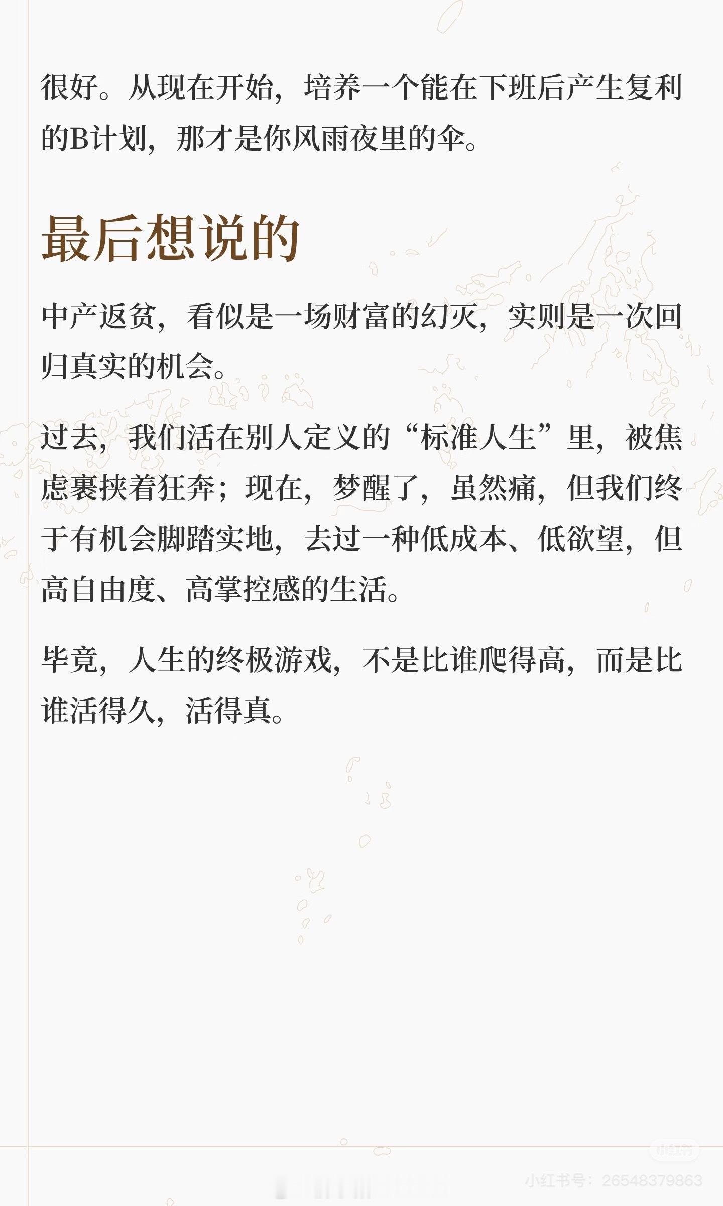 没错,活得久活的真!下班后产生收入的B计划!感谢自己两年前就意识到了不能依靠老公一个人的收入,这风险太大了。这两年,大众点评给了正反馈,本来还想计算一下多少次外餐是点评给的,又因橙V买了多少次的优惠套餐,后来真的有点多了,也懒得算了,生活费就是最好的注解。今年微博也开始发工资了,以前我就觉得别人也写你也写,凭啥别人能赚钱,你不可以,如果你没有把自己定位为说要去做腰部头部,因为你还想做个小透明,那赚点零花钱买菜钱的目标就很容易实现。然后就是再多一份被动收入,今年闲置房装修顺利出租了,每年可以多了近6W的被动收益。还有就是理财,明年算了一下也会有4W的被动收益。有一天真的没了工作了,我们也不会慌,十几年除了12车贷,15盖房装修,17装修,25装修这些特殊年份,年消费一直在15W上下。一直的目标就是被动收入覆盖年消费,但是现在利率已经从6%降到了1.75%。那是有千万现金流才能达成的,而我们没有,所以没什么理由不在主业以外还要考虑B计划,这样生活质量高,开销小,美容护肤,运动健身,娱乐体验,酒吧茶室咖啡馆,特色的餐馆,想想今年那么多免费试就开心。