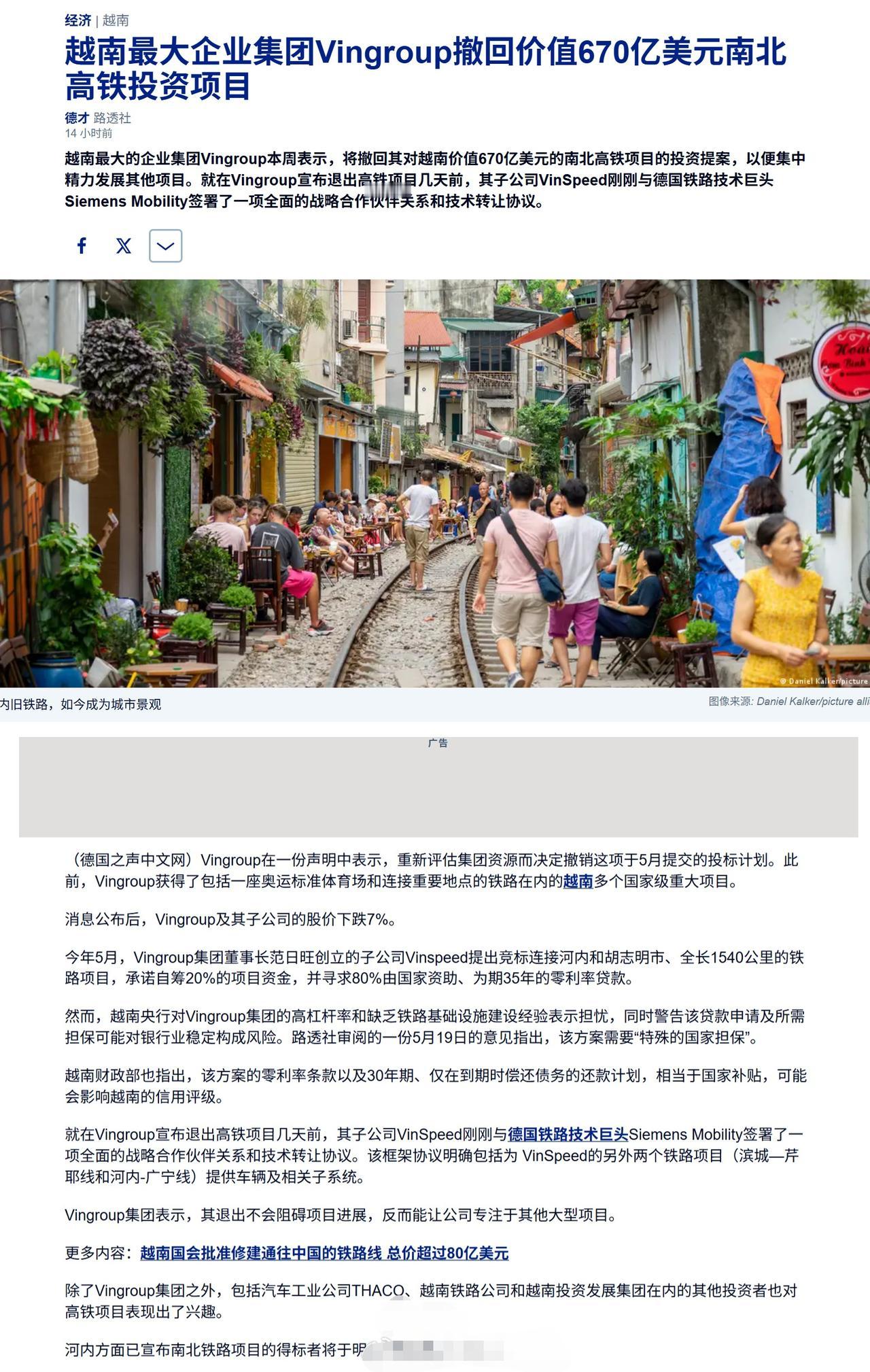 才6天时间,价值670亿美元的高铁项目说签就签,说撤回就撤回?越南这是闹着玩呢。 12月25日,越南首富的企业Vingroup就撤回了与德国西门子公司在12月9日才签定的南北高速铁路合作计划。 越南也想玩二桃杀三士?!结果,真有高铁技术的两个玩家都没有去投标,因为这两个都曾给越南修过轻轨或地铁站,结果沾了一身屎,谁还不开眼继续去他那干活?!钱不好拿还屁事多,是东南亚版阿三。 结果两个高铁技术还不成熟的德国韩国跑去签了合同。这两个在自己的国家都还没有用上高铁,未知成本将会大幅增加。越南本来就没有钱,还需要进口高价列车、信号系统到特种螺栓,价格还是未知的,谁还敢玩?! 西门子:没想到这次入坑和出坑才6天,谢天谢地! 知道你们合作会是个笑话,没想到这个笑话来的这么快。