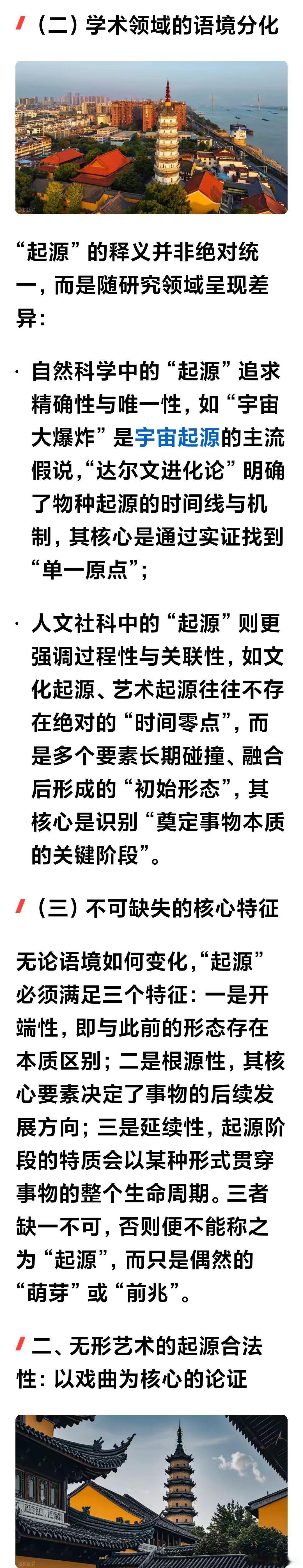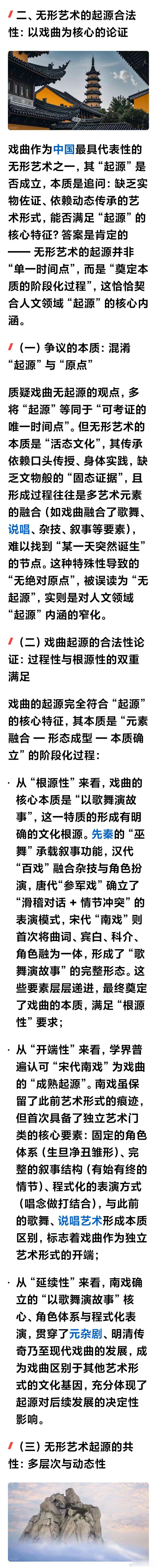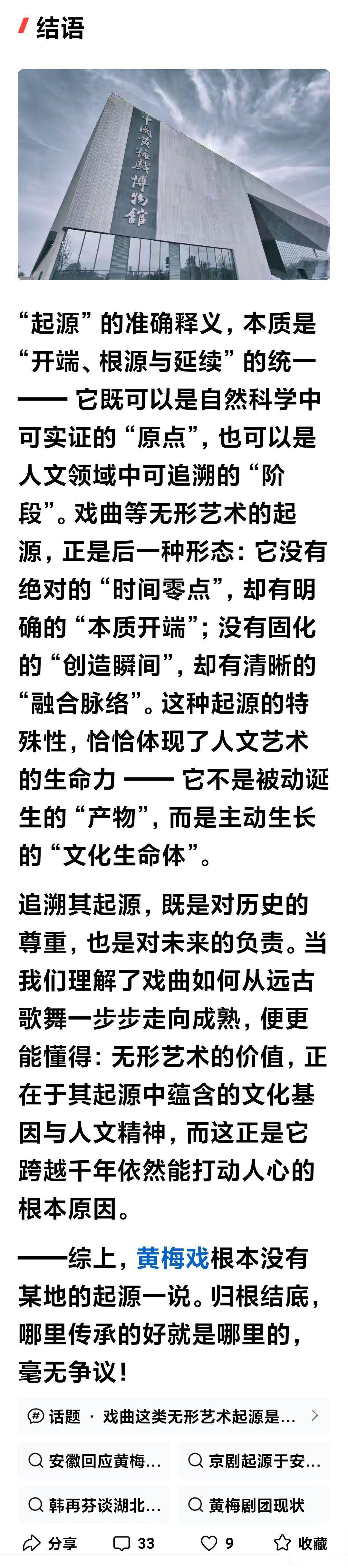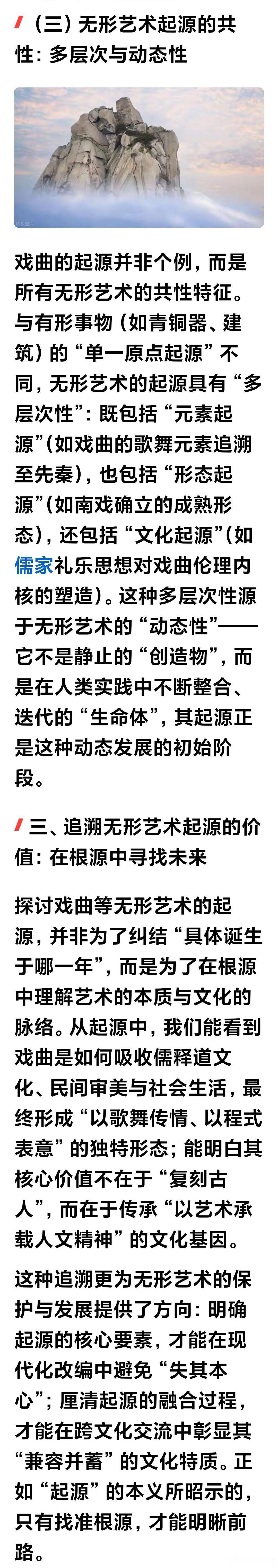 论起源(转载2600字)作者: 论 “起源” 的释义与黄梅戏的起源合法性“起源” 是人类认知世界的核心命题之一,小至一片叶子的萌发,大至文明的诞生,我们总能在追溯 “起源” 中寻找存在的逻辑。但这个看似熟悉的词汇,其准确内涵却需在语境中辨析;而戏曲这类无形艺术的 “起源” 是否成立,更因艺术形态的特殊性引发诸多思考。厘清这些问题,本质是理解人类文化发展的本质规律。B一、“起源” 的准确释义:从语义到学术的双重界定B(一)语义层面的核心内涵“起源” 由 “起” 与 “源” 构成,本义直指事物产生的开端与根源。《现代汉语词典》将其定义为 “事物发生的根源”,《辞海》则补充为 “事物最初产生的时间、地点与条件”。从语义结构看,“起” 侧重时间上的 “开端性”—— 强调从无到有的临界点;“源” 侧重逻辑上的 “根源性”—— 强调决定事物本质的核心要素。二者结合,“起源” 的基本含义可概括为:某一事物在特定时空条件下,由核心要素催生并开启自身发展脉络的初始阶段。B(二)学术领域的语境分化“起源” 的释义并非绝对统一,而是随研究领域呈现差异:自然科学中的 “起源” 追求精确性与唯一性,如 “宇宙大爆炸” 是宇宙起源的主流假说,“达尔文进化论” 明确了物种起源的时间线与机制,其核心是通过实证找到 “单一原点”;人文社科中的 “起源” 则更强调过程性与关联性,如文化起源、艺术起源往往不存在绝对的 “时间零点”,而是多个要素长期碰撞、融合后形成的 “初始形态”,其核心是识别 “奠定事物本质的关键阶段”。B(三)不可缺失的核心特征无论语境如何变化,“起源” 必须满足三个特征:一是开端性,即与此前的形态存在本质区别;二是根源性,其核心要素决定了事物的后续发展方向;三是延续性,起源阶段的特质会以某种形式贯穿事物的整个生命周期。三者缺一不可,否则便不能称之为 “起源”,而只是偶然的 “萌芽” 或 “前兆”。B二、无形艺术的起源合法性:以戏曲为核心的论证戏曲作为中国最具代表性的无形艺术之一,其 “起源” 是否成立,本质是追问:缺乏实物佐证、依赖动态传承的艺术形式,能否满足 “起源” 的核心特征?答案是肯定的 —— 无形艺术的起源并非 “单一时间点”,而是 “奠定本质的阶段化过程”,这恰恰契合人文领域 “起源” 的核心内涵。B(一)争议的本质:混淆 “起源” 与 “原点”质疑戏曲无起源的观点,多将 “起源” 等同于 “可考证的唯一时间点”。但无形艺术的本质是 “活态文化”,其传承依赖口头传授、身体实践,缺乏文物般的 “固态证据”,且形成过程往往是多艺术元素的融合(如戏曲融合了歌舞、说唱、杂技、叙事等要素),难以找到 “某一天突然诞生” 的节点。这种特殊性导致的 “无绝对原点”,被误读为 “无起源”,实则是对人文领域 “起源” 内涵的窄化。B(二)戏曲起源的合法性论证:过程性与根源性的双重满足戏曲的起源完全符合 “起源” 的核心特征,其本质是 “元素融合 — 形态成型 — 本质确立” 的阶段化过程:从 “根源性” 来看,戏曲的核心本质是 “以歌舞演故事”,这一特质的形成有明确的文化根源。先秦的 “巫舞” 承载叙事功能,汉代 “百戏” 融合杂技与角色扮演,唐代“参军戏” 确立了 “滑稽对话 + 情节冲突” 的表演模式,宋代 “南戏” 则首次将曲词、宾白、科介、角色融为一体,形成了 “歌舞演故事” 的完整形态。这些要素层层递进,最终奠定了戏曲的本质,满足 “根源性” 要求;从 “开端性” 来看,学界普遍认可 “宋代南戏” 为戏曲的 “成熟起源”。南戏虽保留了此前艺术形式的痕迹,但首次具备了独立艺术门类的核心要素:固定的角色体系(生旦净丑雏形)、完整的叙事结构(有始有终的情节)、程式化的表演方式(唱念做打结合),与此前的歌舞、说唱艺术形成本质区别,标志着戏曲作为独立艺术形式的开端;从 “延续性” 来看,南戏确立的 “以歌舞演故事” 核心、角色体系与程式化表演,贯穿了元杂剧、明清传奇乃至现代戏曲的发展,成为戏曲区别于其他艺术形式的文化基因,充分体现了起源对后续发展的决定性影响。B(三)无形艺术起源的共性:多层次与动态性戏曲的起源并非个例,而是所有无形艺术的共性特征。与有形事物(如青铜器、建筑)的 “单一原点起源” 不同,无形艺术的起源具有 “多层次性”:既包括 “元素起源”(如戏曲的歌舞元素追溯至先秦),也包括 “形态起源”(如南戏确立的成熟形态),还包括 “文化起源”(如儒家礼乐思想对戏曲伦理内核的塑造)。这种多层次性源于无形艺术的 “动态性”—— 它不是静止的 “创造物”,而是在人类实践中不断整合、迭代的 “生命体”,其起源正是这种动态发展的初始阶段。B三、追溯无形艺术起源的价值:在根源中寻找未来探讨戏曲等无形艺术的起源,并非为了纠结 “具体诞生于哪一年”,而是为了在根源中理解艺术的本质与文化的脉络。从起源中,我们能看到戏曲是如何吸收儒释道文化、民间审美与社会生活,最终形成 “以歌舞传情、以程式表意” 的独特形态;能明白其核心价值不在于 “复刻古人”,而在于传承 “以艺术承载人文精神” 的文化基因。这种追溯更为无形艺术的保护与发展提供了方向:明确起源的核心要素,才能在现代化改编中避免 “