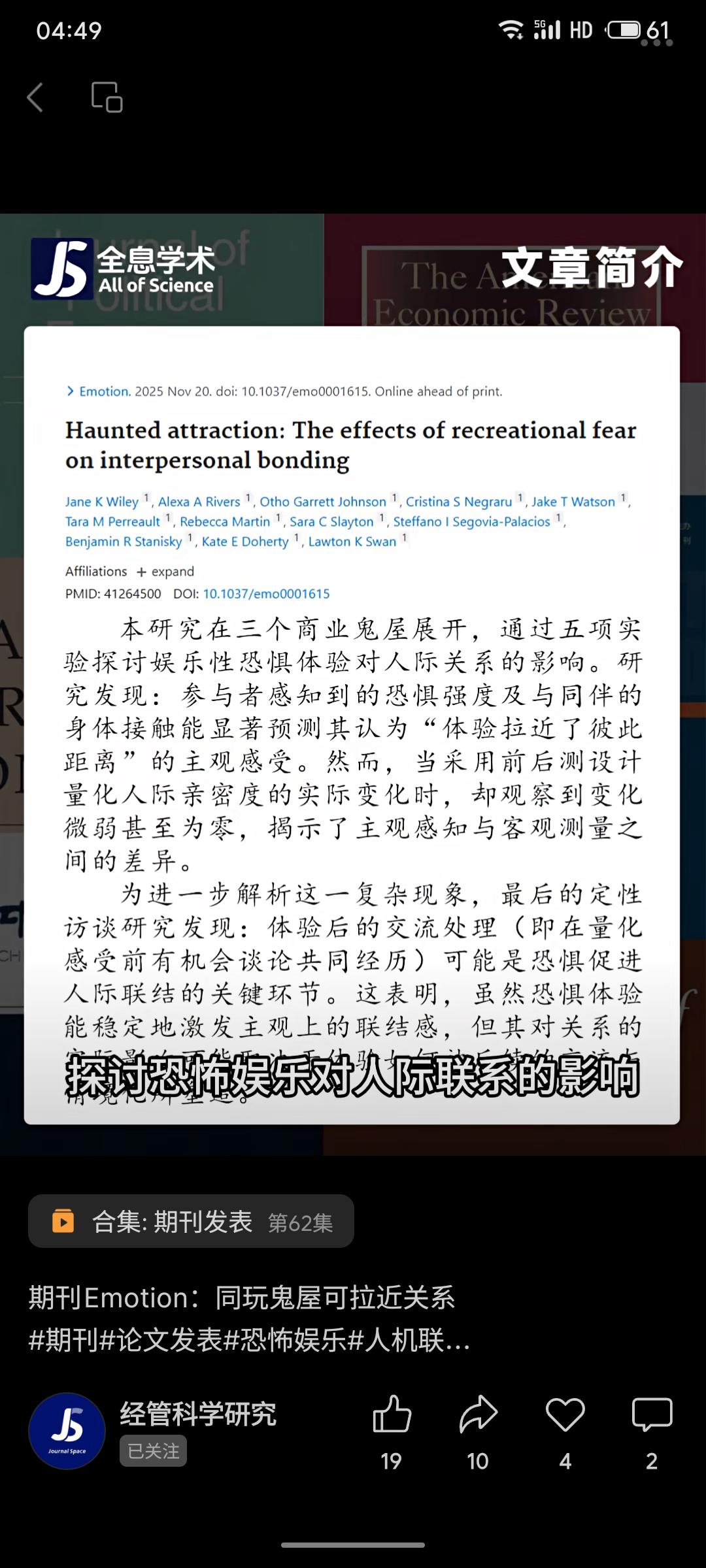 《情感》期刊研究发现,同玩鬼屋时感知的恐惧强度与身体接触能显著增强“彼此更亲近”的主观感受,但客观测量的人际亲密度实际变化微弱。研究指出,体验后的交流可能是恐惧促进联结的关键环节,揭示了主观感知与客观效果间的差异。