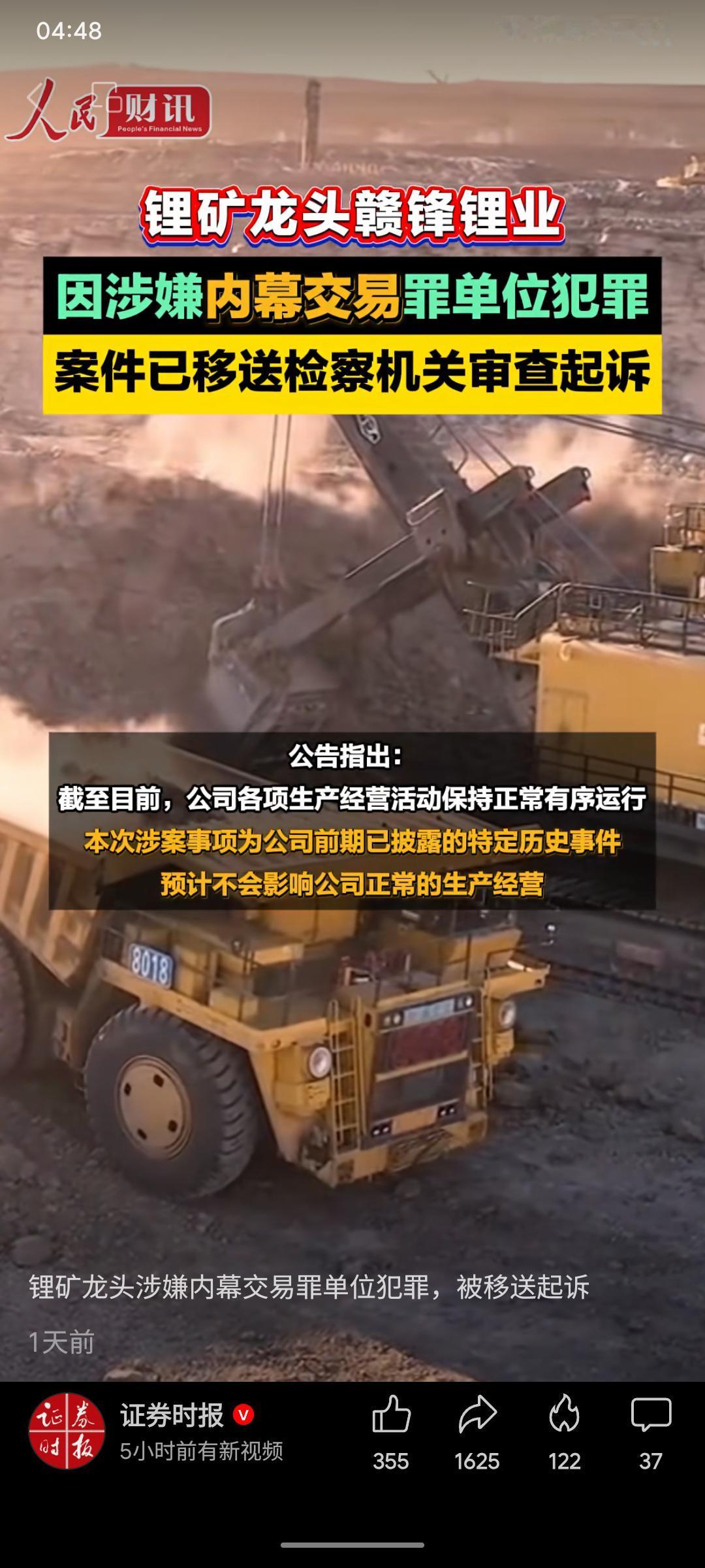 锂业龙头赣锋锂业因涉嫌内幕交易罪(单位犯罪),案件已由公安机关移送检察机关审查起诉。公司公告称此事为前期已披露的历史事件,目前生产经营正常,预计不受影响。