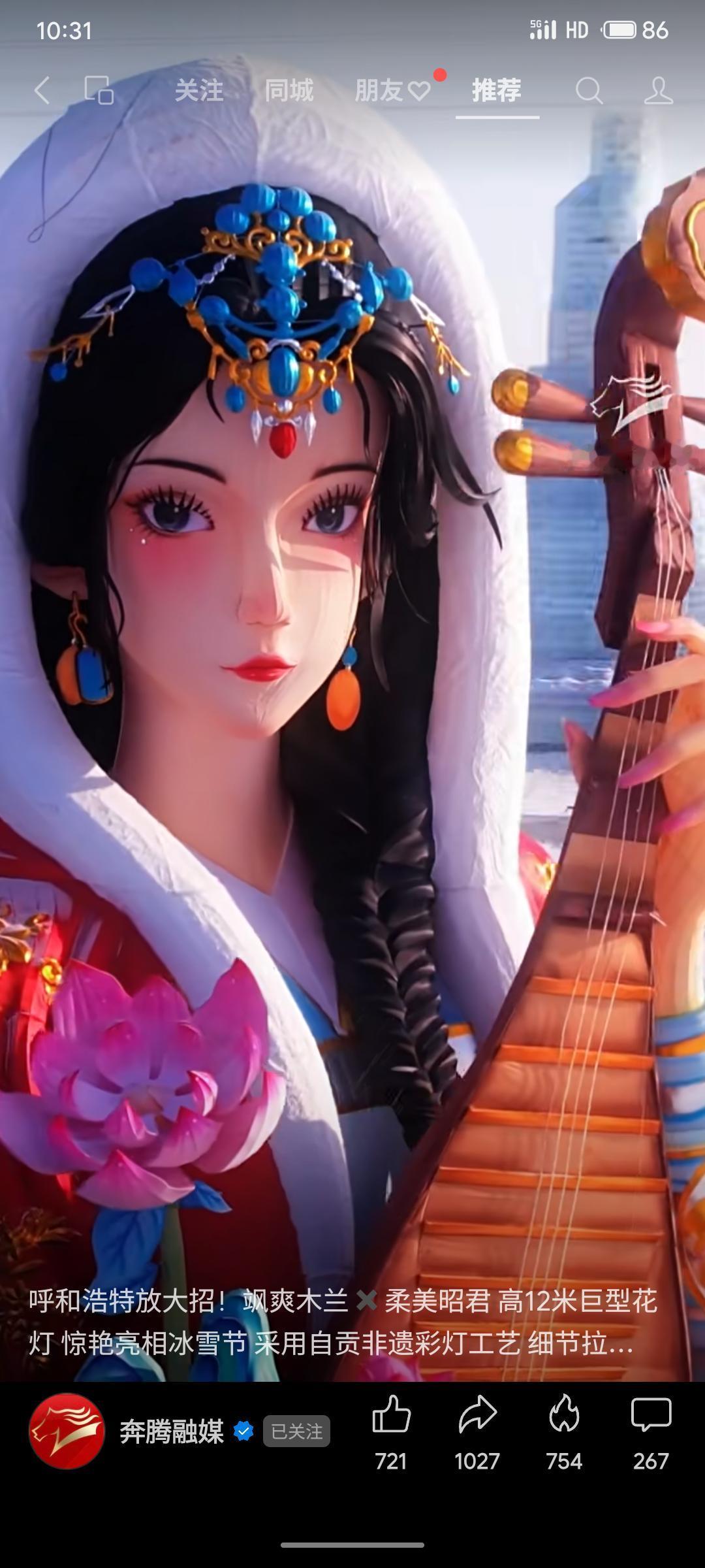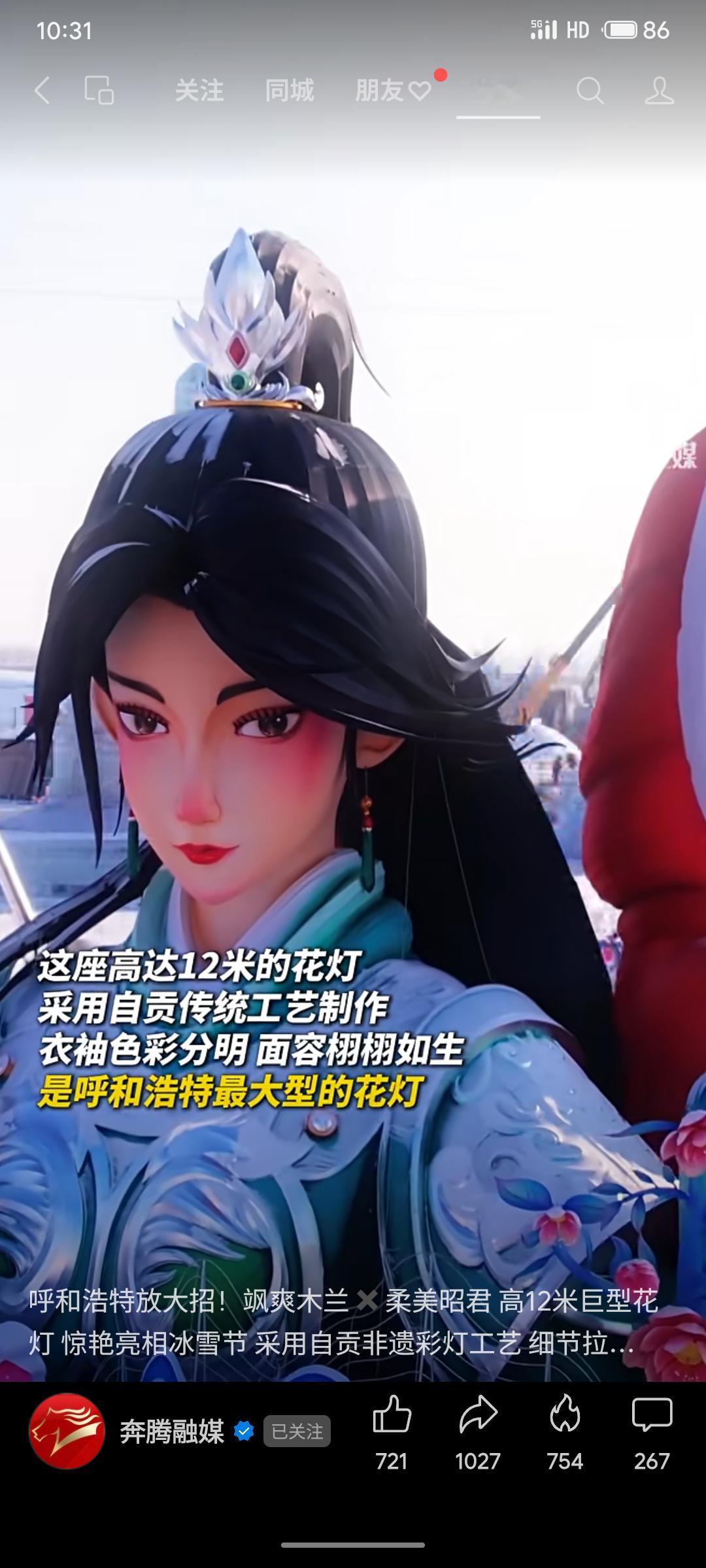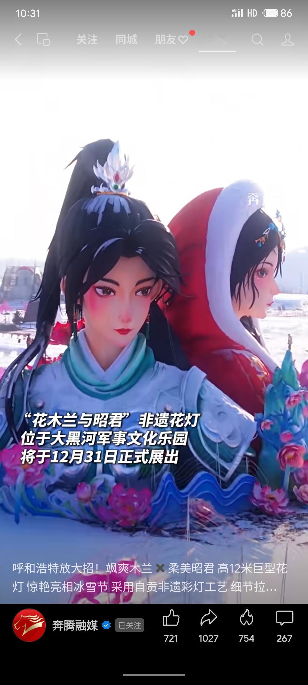 呼和浩特冰雪节将展出高达12米的“花木兰与王昭君”巨型花灯,采用自贡非遗彩灯工艺制作,细节精美,栩栩如生。该花灯位于大黑河军事文化乐园,计划于12月31日正式亮相。