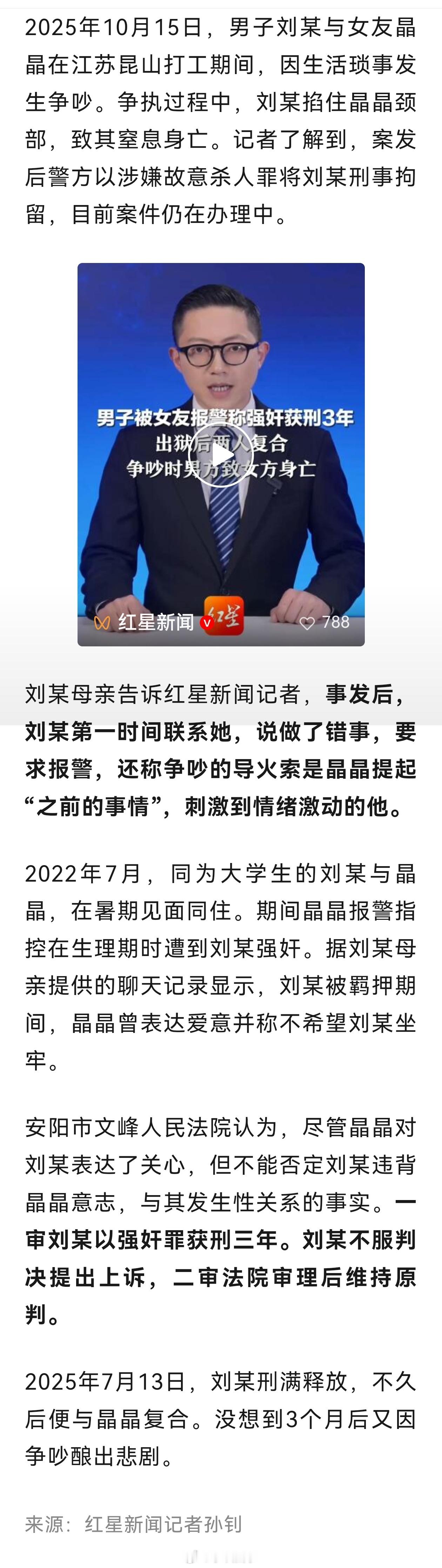 早知今日,何必当初?谈恋爱必须要选对人,不合适的人就不要感情用事一味冲动强行在一起。这不,这个男子刚从监狱出来三个月就又出了事。受害人还是他之前案件的受害人同居女友。2022年7月,小伙和女友同居期间,因为在女友生理期强奸女友被女友告发,后被判刑三年。2025年7月,男子服刑期满出来后又跟前女友复合。结果在一起没多长时间,又因琐事争吵而把前女友掐死。案件已经被公安机关立案侦查,这次涉嫌的罪名是故意杀人。受害女友的手机记录显示曾在男子服刑期间向男子表白,不希望男子坐牢。但是,这两人确实不该在一起!过于感情用事的在一起,只能导致矛盾升级、事态失控,造成命案,造成悲剧!强奸和故意杀人都是重罪,这个男子又构成累犯,这一次估计至少会在无期以上判刑。一段本不该有孽缘,让一个年轻人失去了生命,让另一个年轻人亲手毁掉了自己的一生。着实让人警醒!