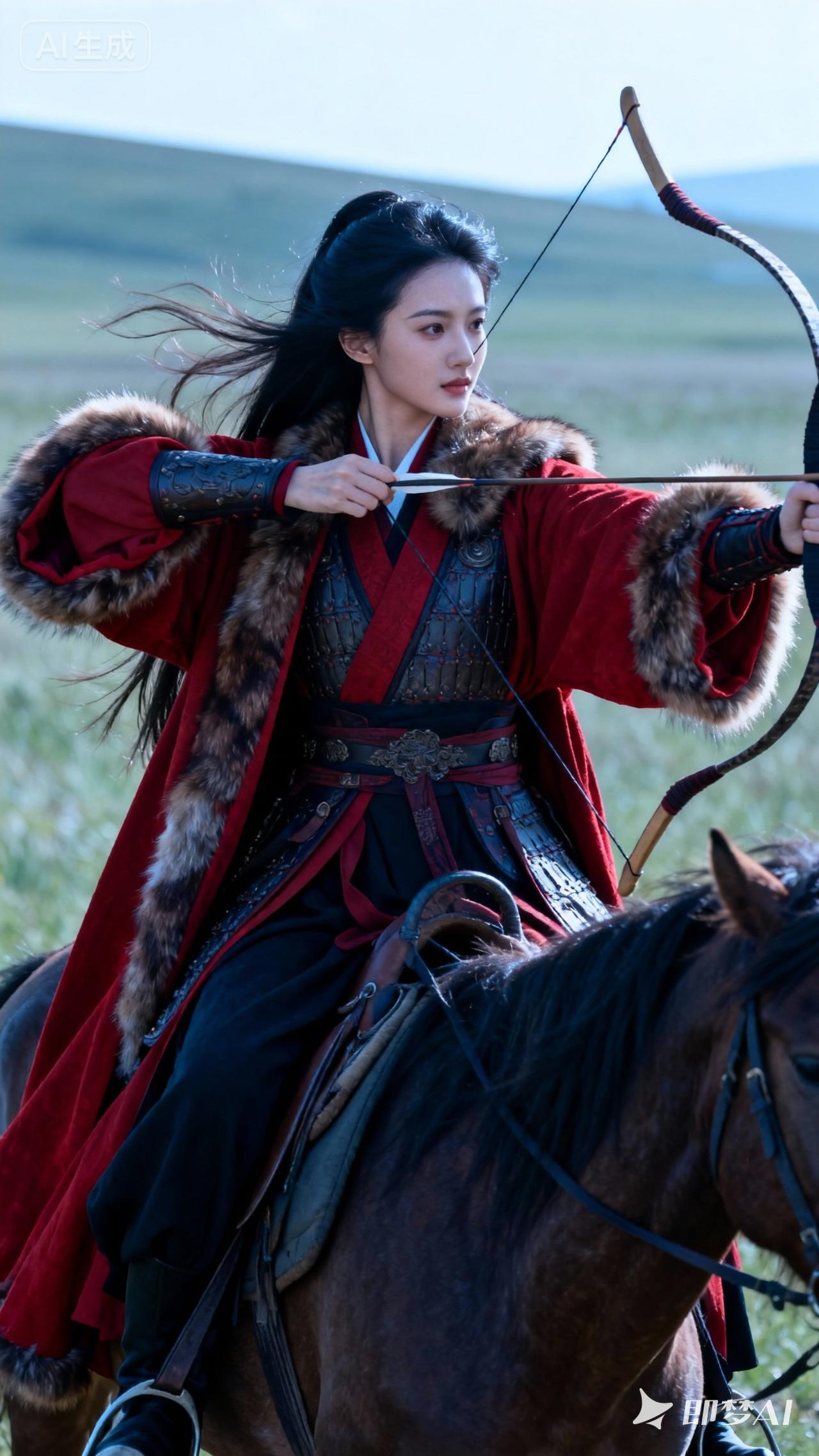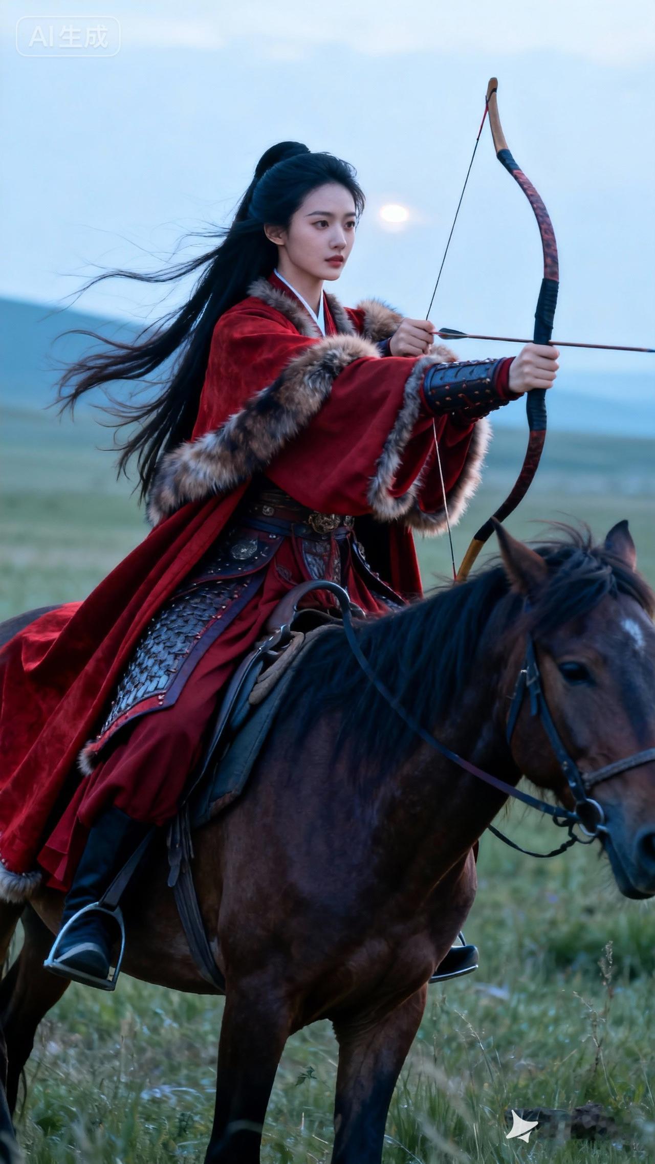 红衣女骑马,弯弓射天狼。