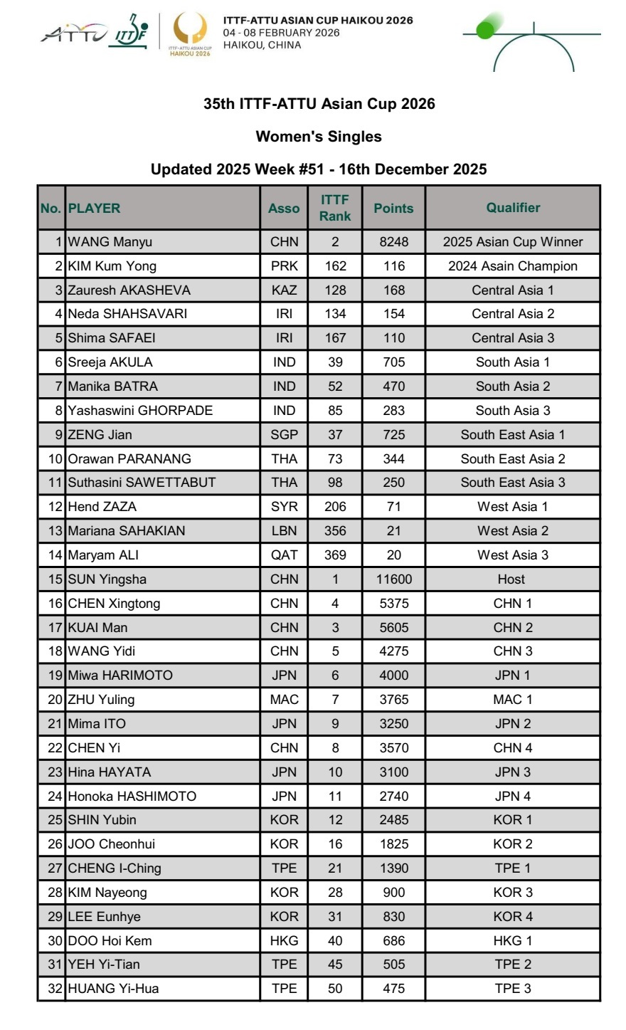 2026 ITTF-ATTU海口亚洲杯受邀参赛人员名单