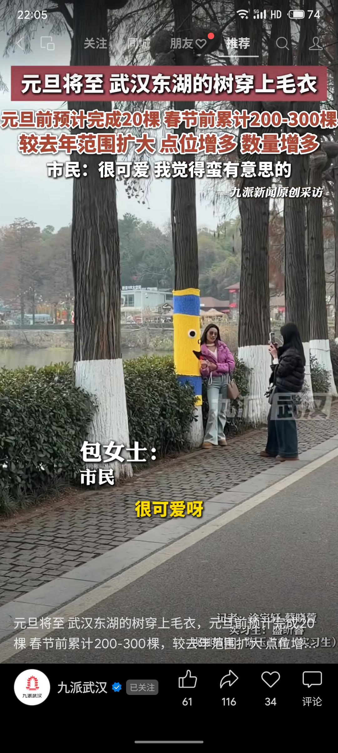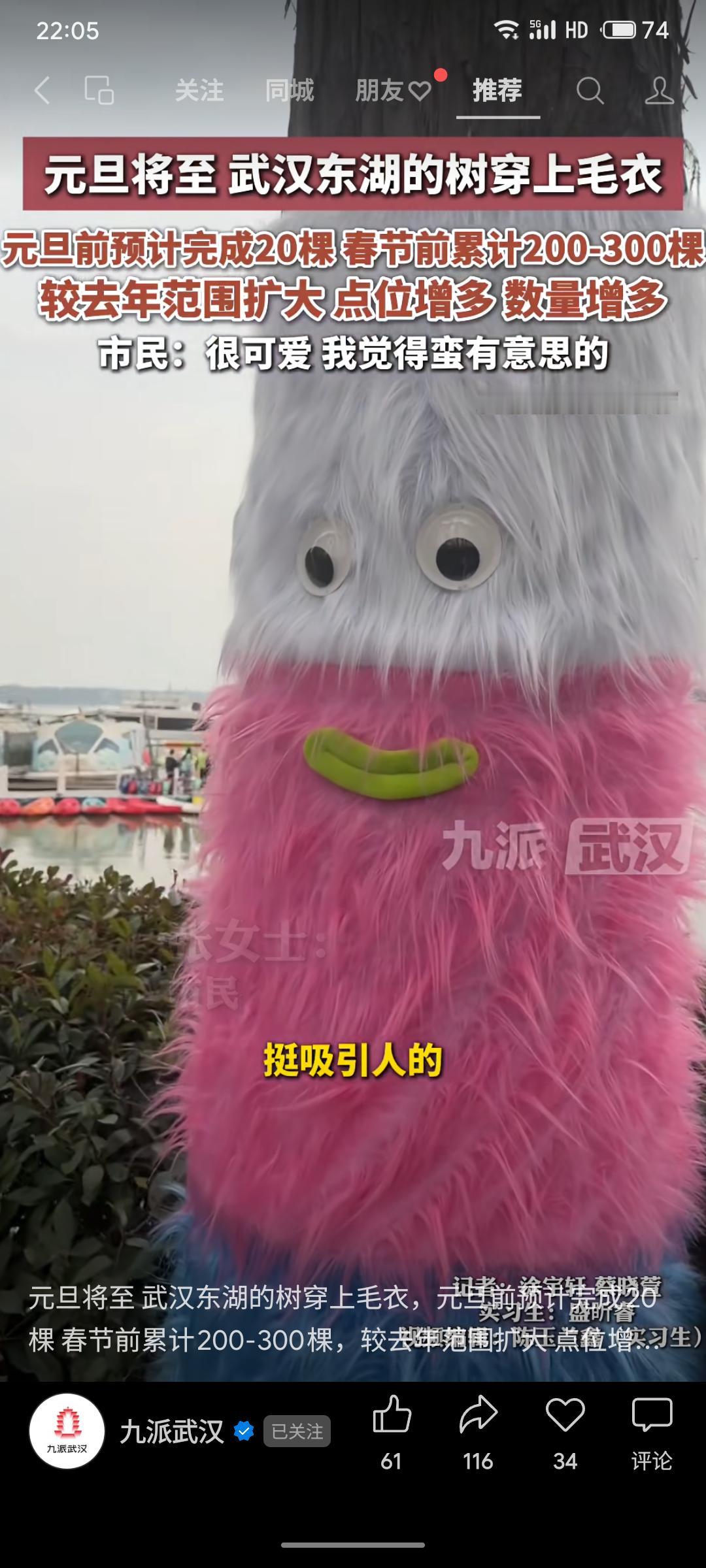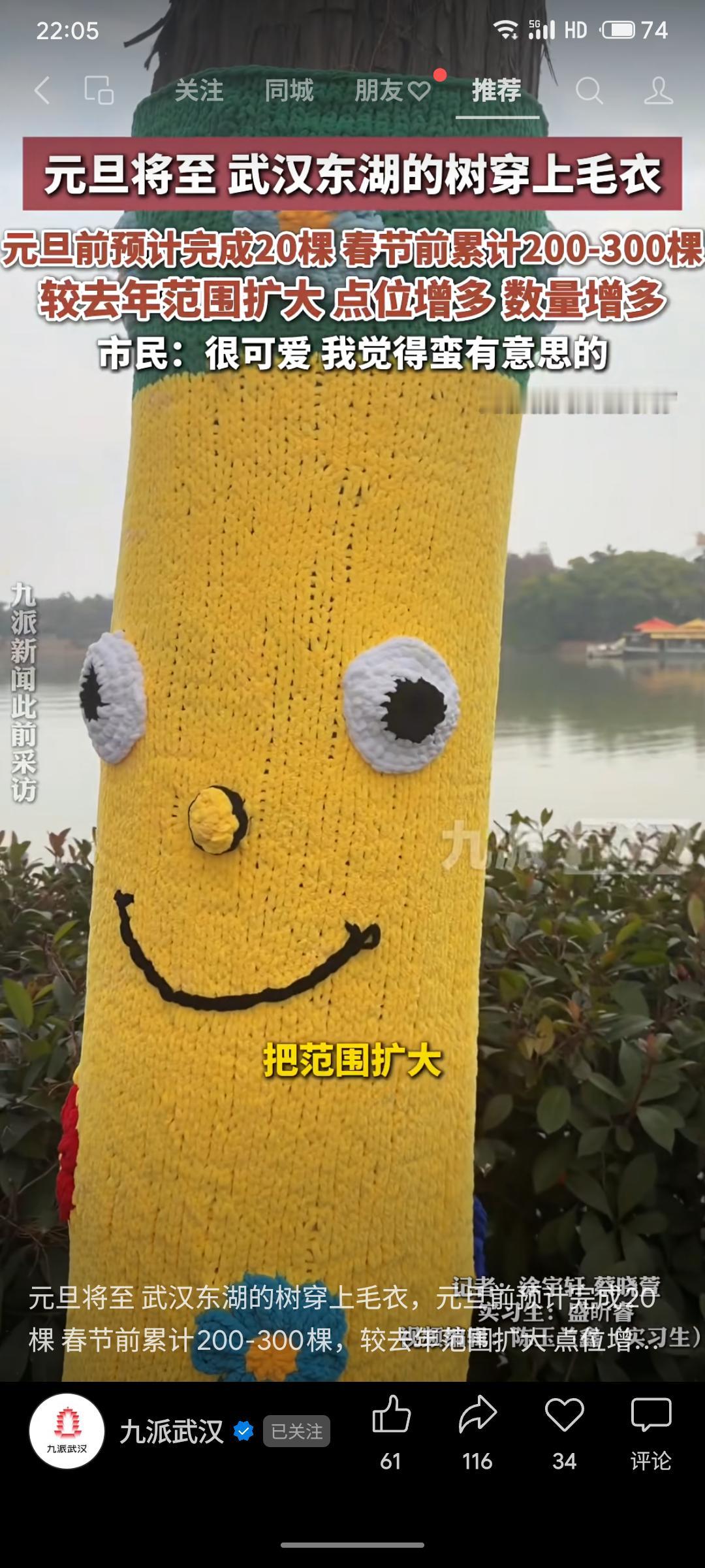 元旦临近,武汉东湖景区为树木穿上彩色毛衣,预计春节前将装饰200-300棵。该活动范围较去年扩大,市民纷纷表示“很可爱,有意思”,为冬日景观增添了温暖与趣味。