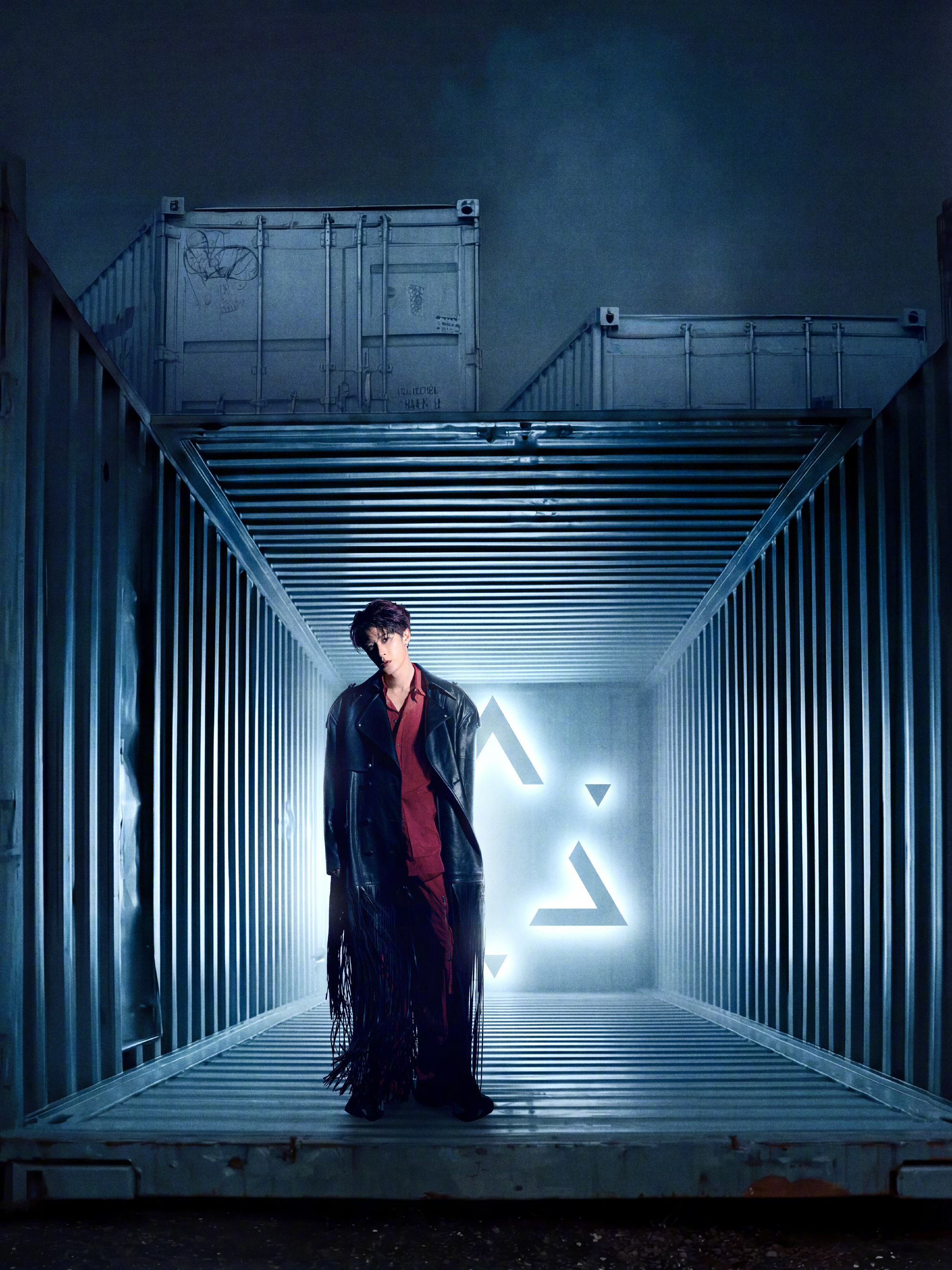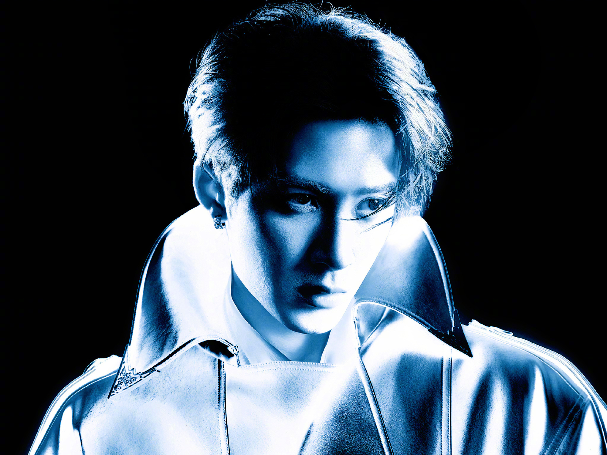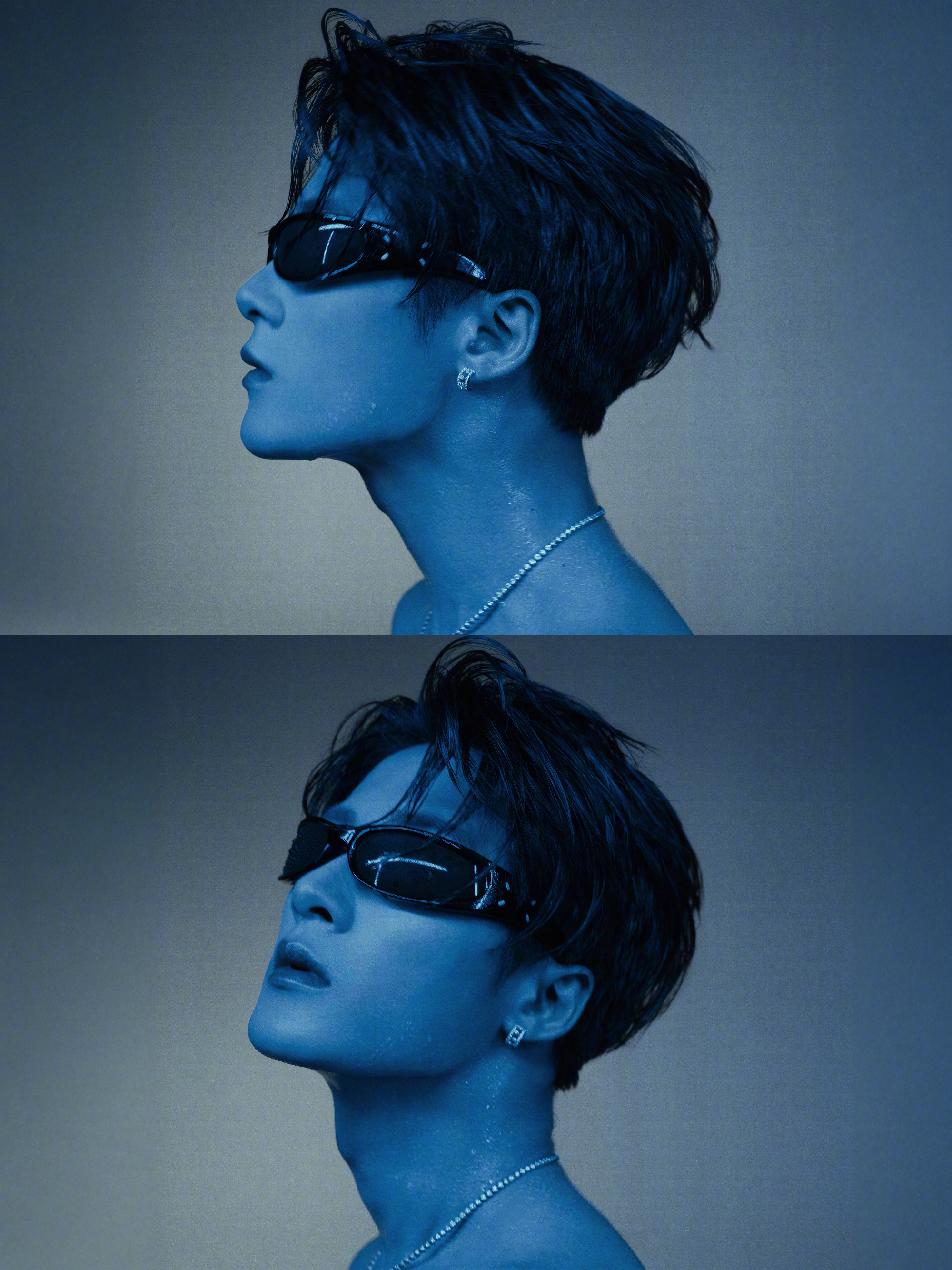 檀健次 今晚 造型图,穿着Fendi套装和皮革流苏大衣,佩戴DeBeers高级珠宝,冷调蓝光交错,酷帅的未来主义画风,关于「我」的时髦表达。💙❤️🖤